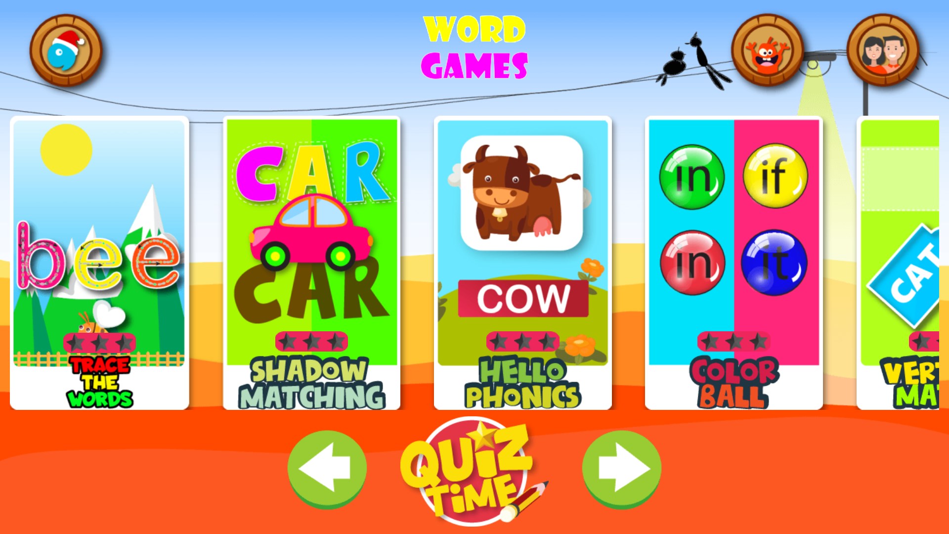 Educational games to teach your kids English Alphabet, Phonics games, Vocabulary and Sight Word games. To teach your kindergartener Letters, phonics,Rhyming words. etc. A fun learning app to help child read and build vocabulary. Word making games not only helps the kids to improve vocabulary and spellings but also help them learn English phonetic for Alphabet. Kids can also learn about the Sight words with the help of fun learning pedagogy.
