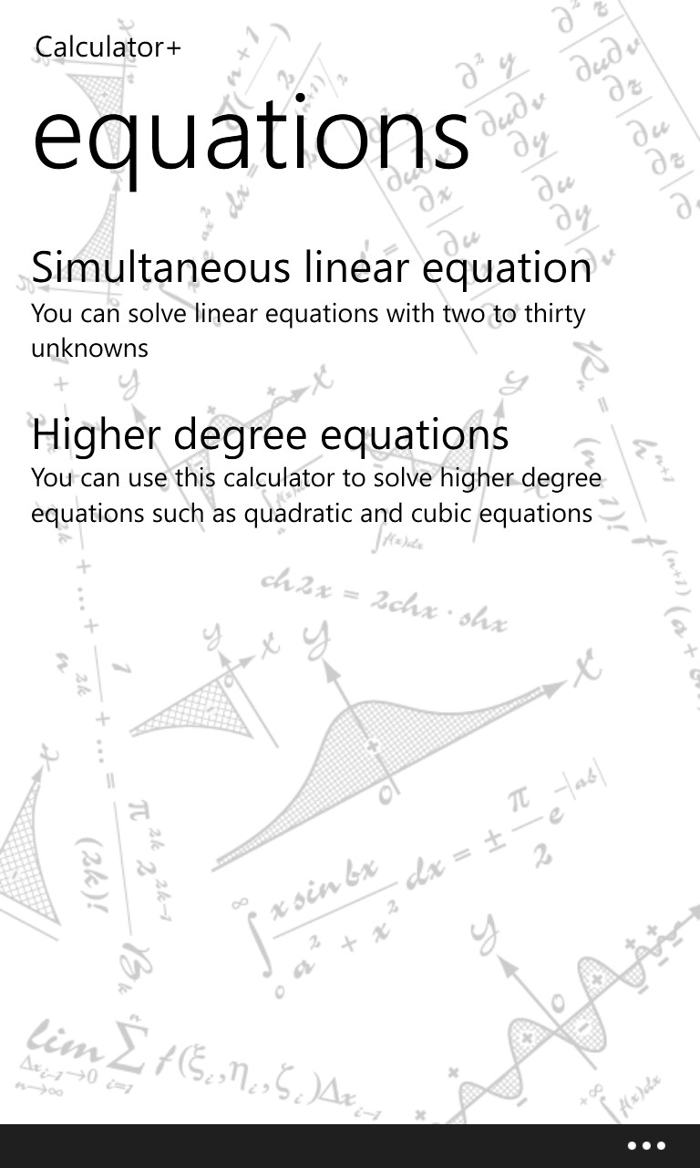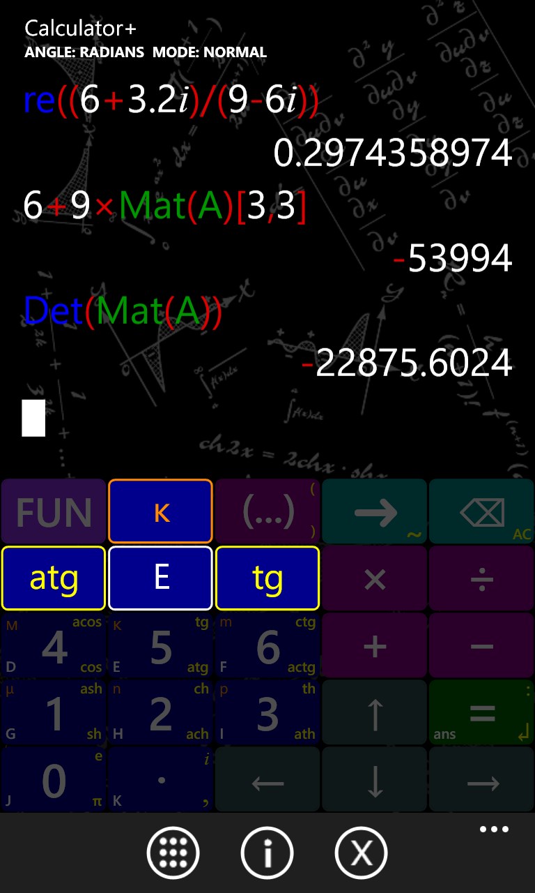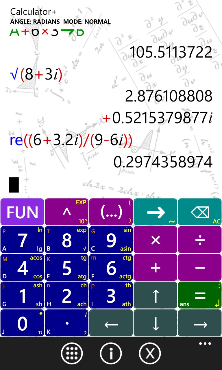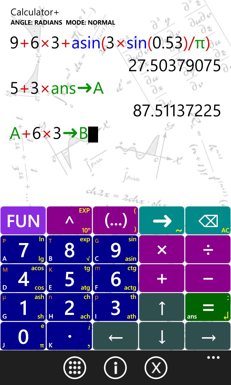 Calculator+ is a great replacement for your existing Windows Phone® calculator. Calculator+ allows ordinary and scientific calculations. Calculator+ is the most functional calculator in the Windows phone store! Some of the supported features Сalculator+: