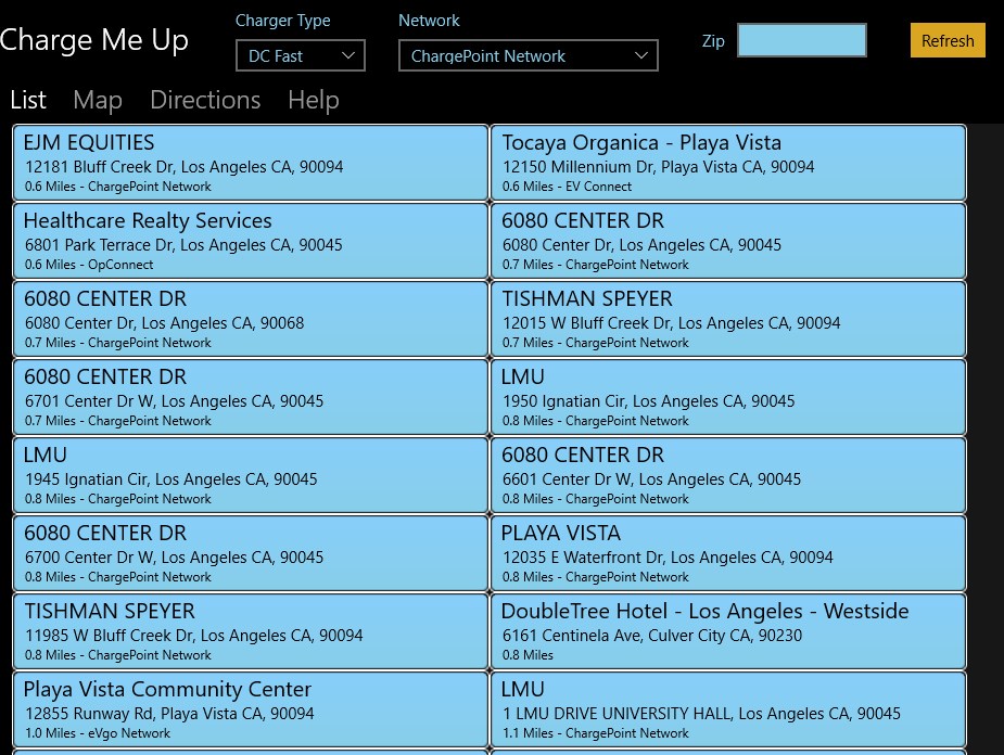 You can now restrict the charge station list by type, such as DC Fast and network, such as Chargepoint. A zip code can also be entered to specify a location.