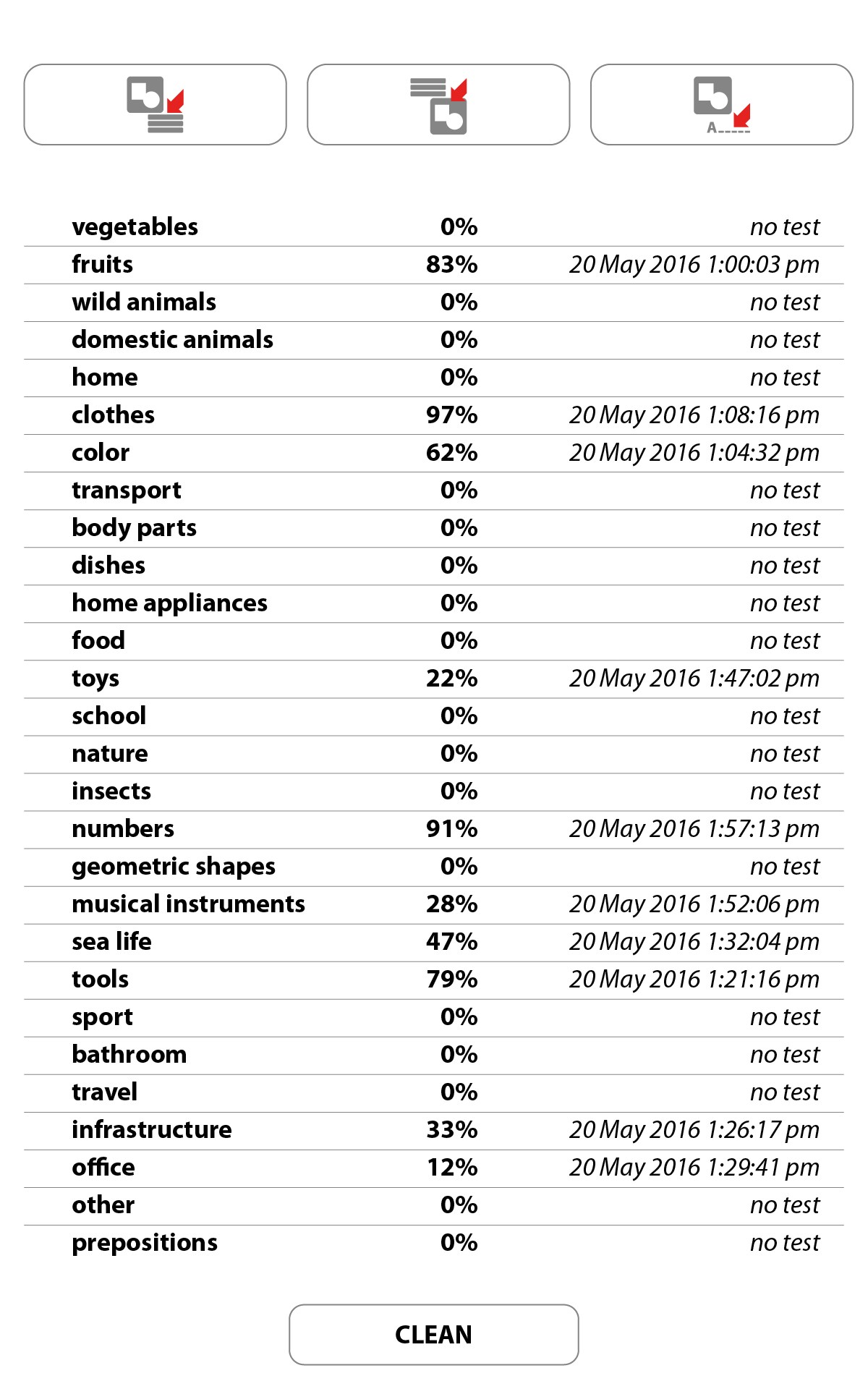 Full list of topics: vegetables, fruits, wild animals, pets, house, clothing, colors, transport, body parts, tableware, home appliances, food, toys, school, nature, insects, numbers, geometry, musical instruments, sea life, tools, sports, bathroom, travel, infrastructure, office, miscellaneous.