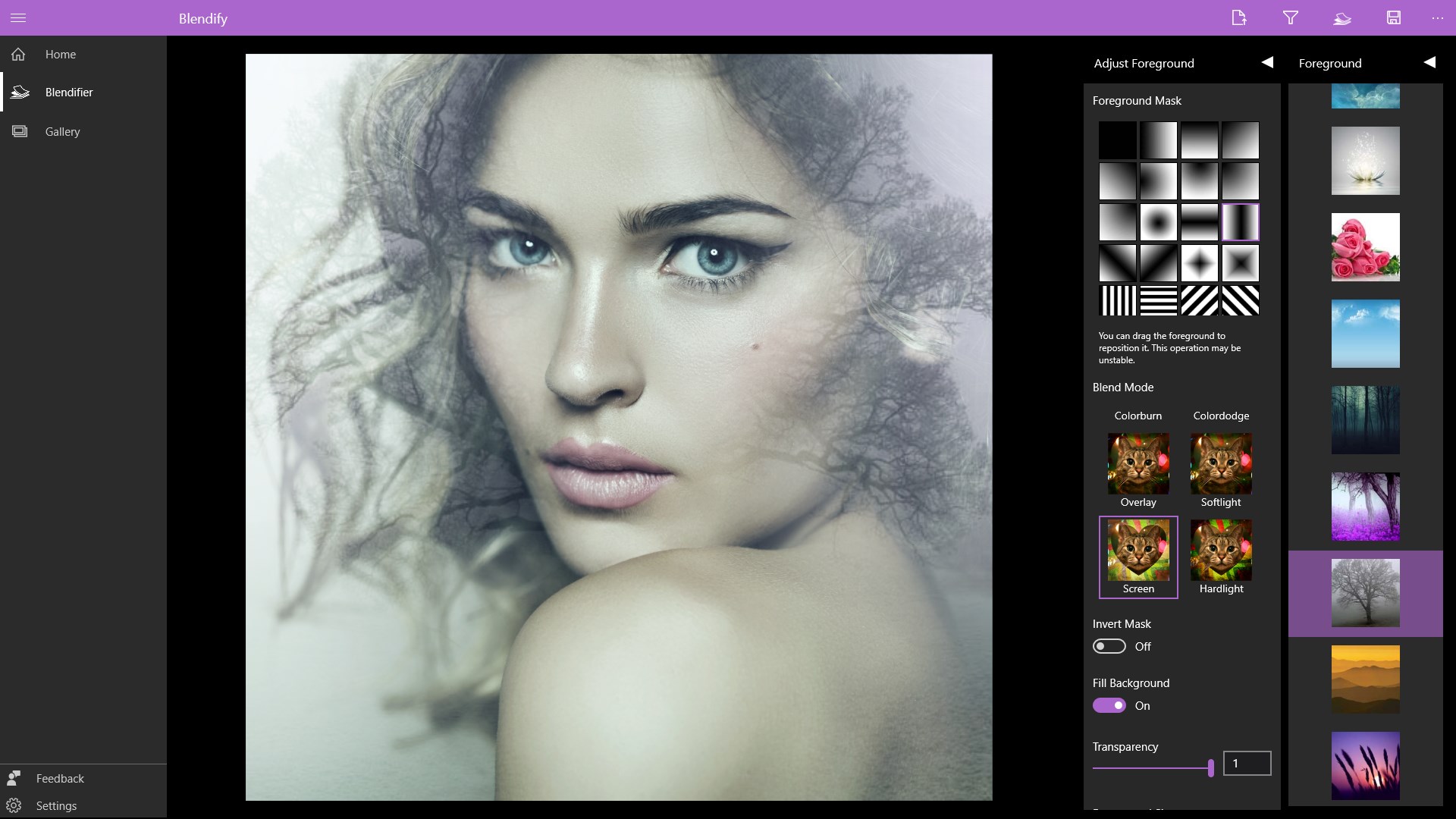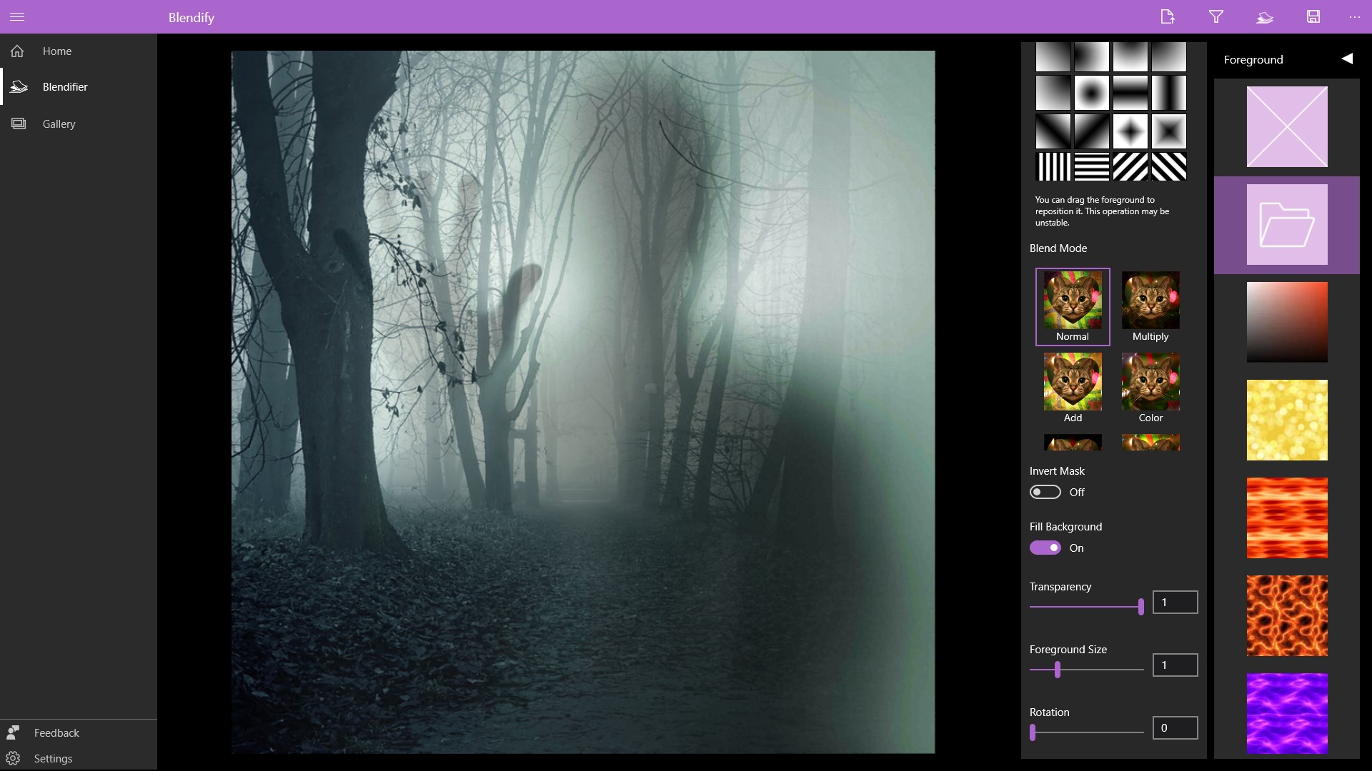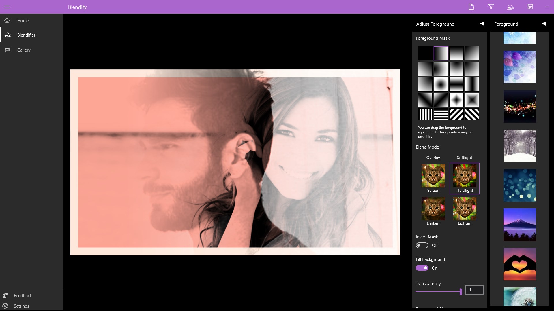 Add pictures from you gallery, camera or from beautiful premade imagesDoes not force you to crop your picturesManipulate foreground image position with touch or mouseFreely resize and rotate foreground images.Supports various blend functions including multiply, add, colorburn, darken, softlight and more.Apply masks to define beautiful transition between photosThe most feature rich app to blend images for Windows 10. Intuitive and very easy to use