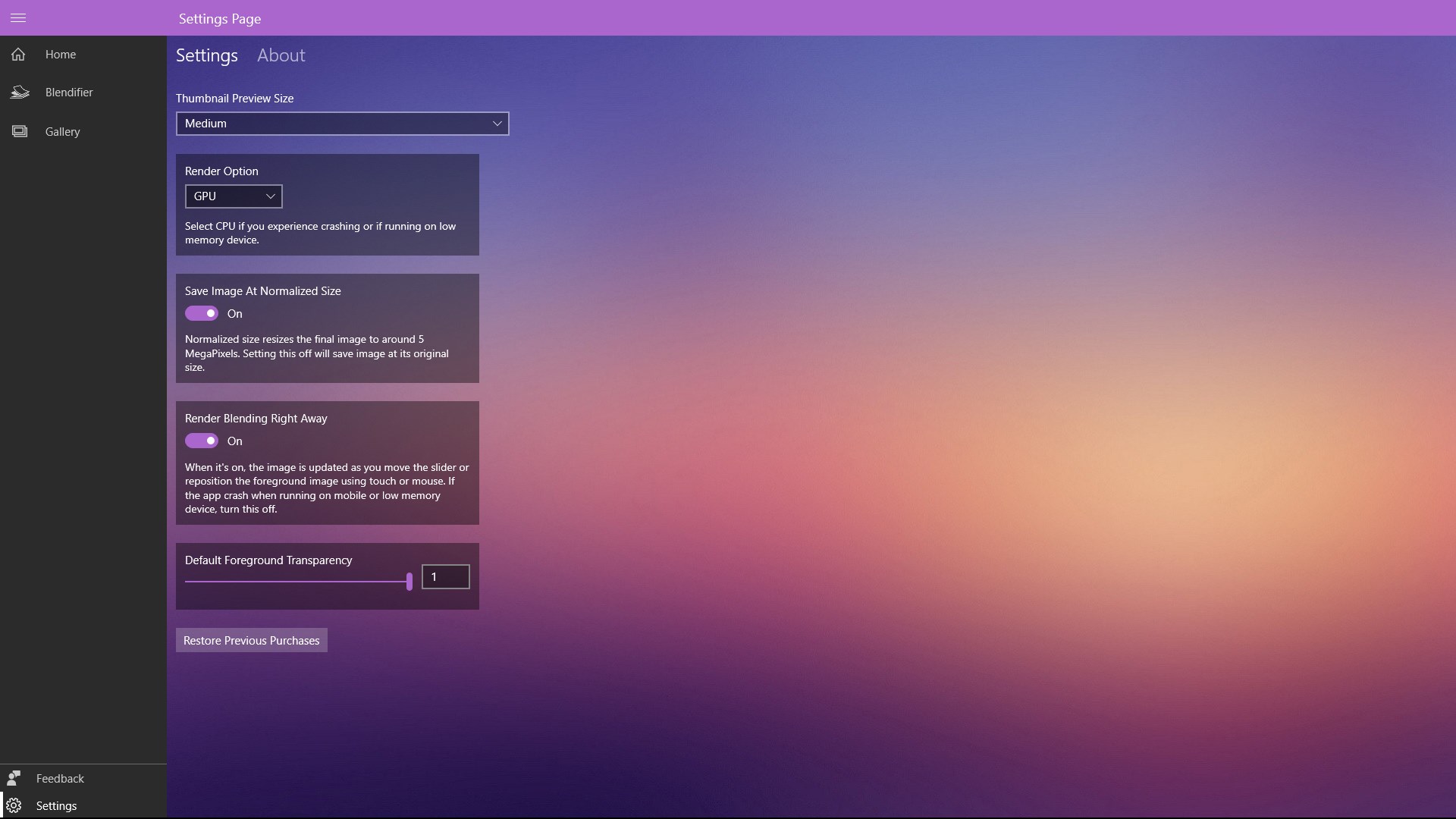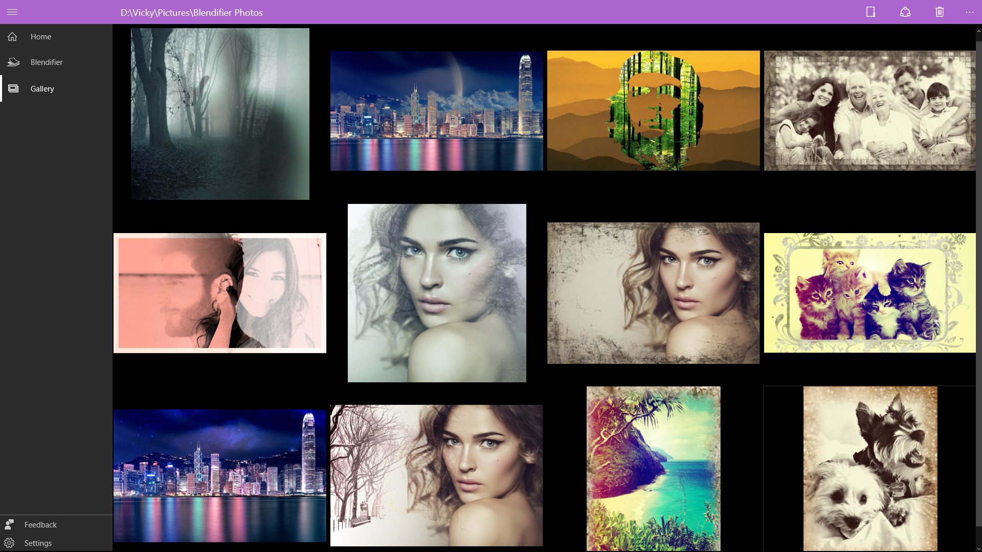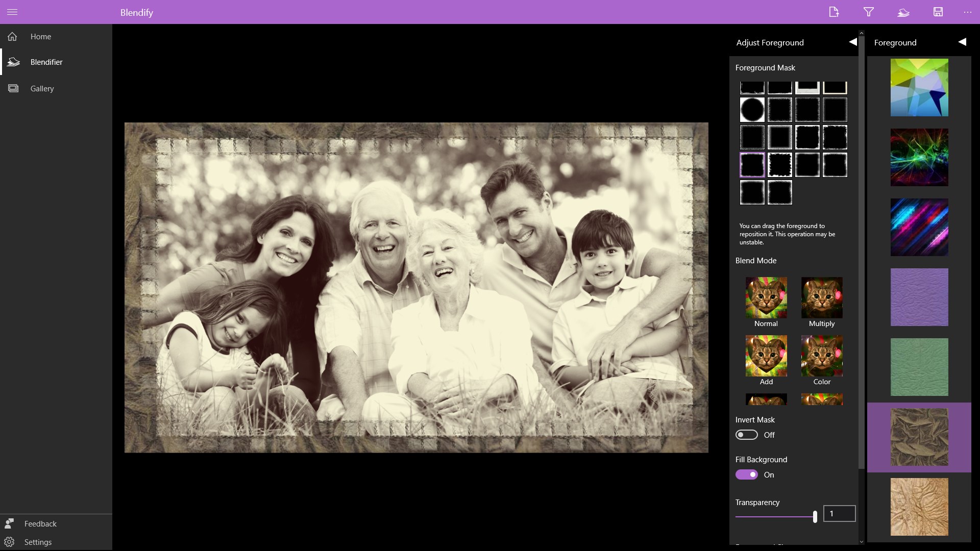Add pictures from you gallery, camera or from beautiful premade imagesDoes not force you to crop your picturesManipulate foreground image position with touch or mouseFreely resize and rotate foreground images.Supports various blend functions including multiply, add, colorburn, darken, softlight and more.Apply masks to define beautiful transition between photosThe most feature rich app to blend images for Windows 10. Intuitive and very easy to use