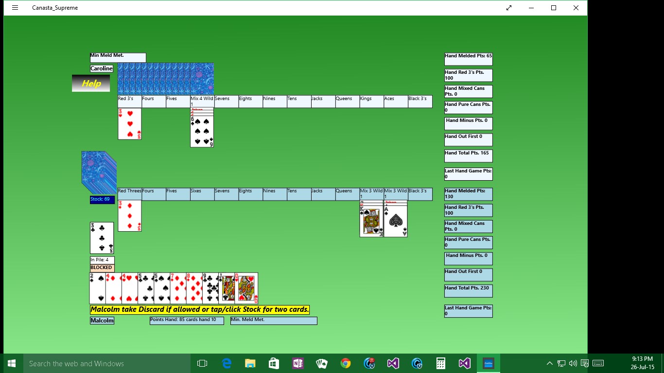 Canasta is a fascinating Rummy type card game in which you collect or meld 'baskets' of cards, Canasta being the Spanish word for basket. Played with two packs of cards and four Jokers, you must make melds of 7 or more cards and these are called Canastas. This is the Classic version in which you play against the computer. Now with greatly improved graphics. This is an update correcting a bug pointed out by customer and improved layout.