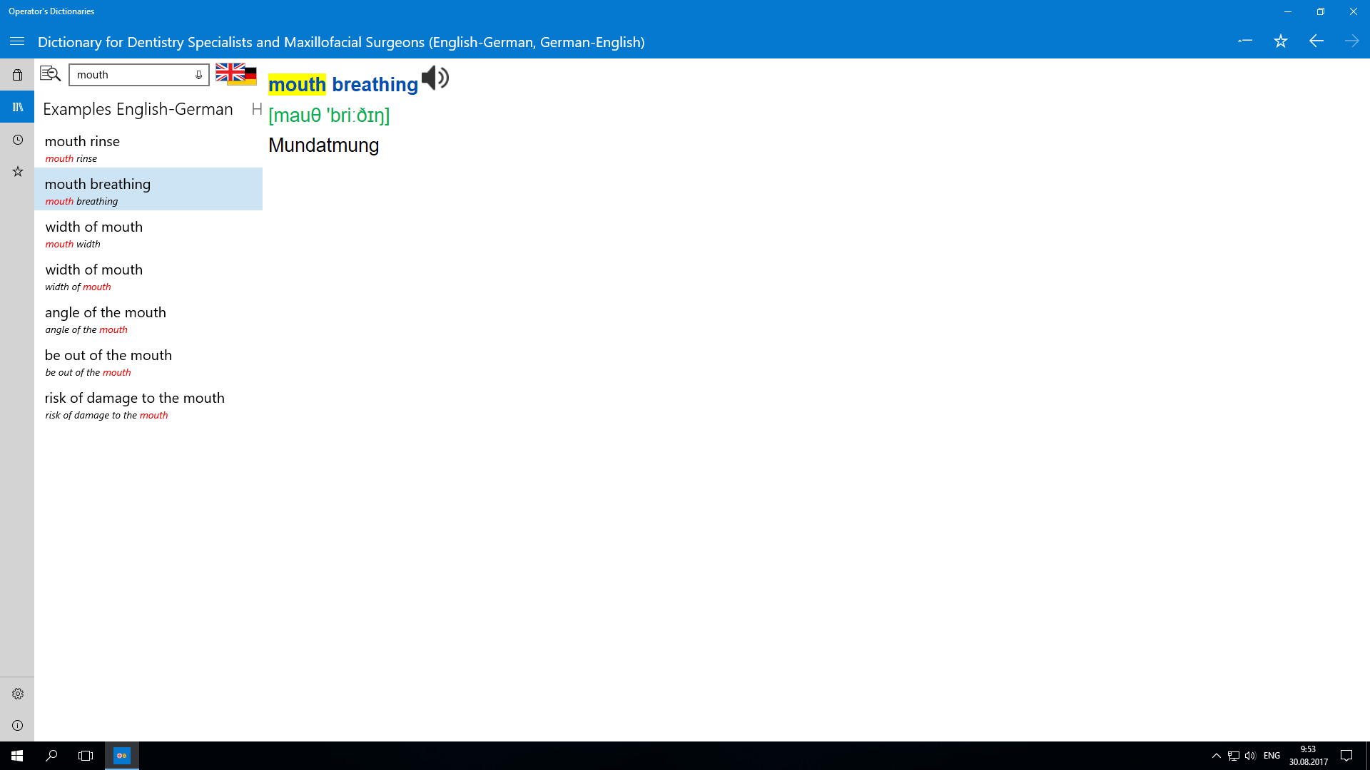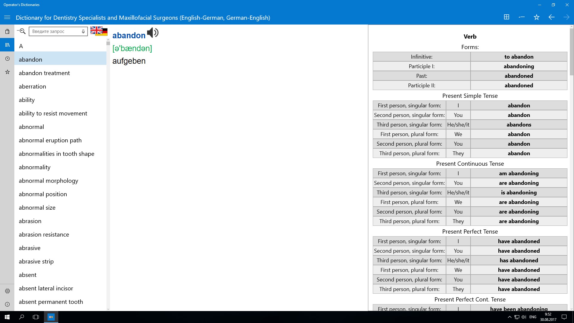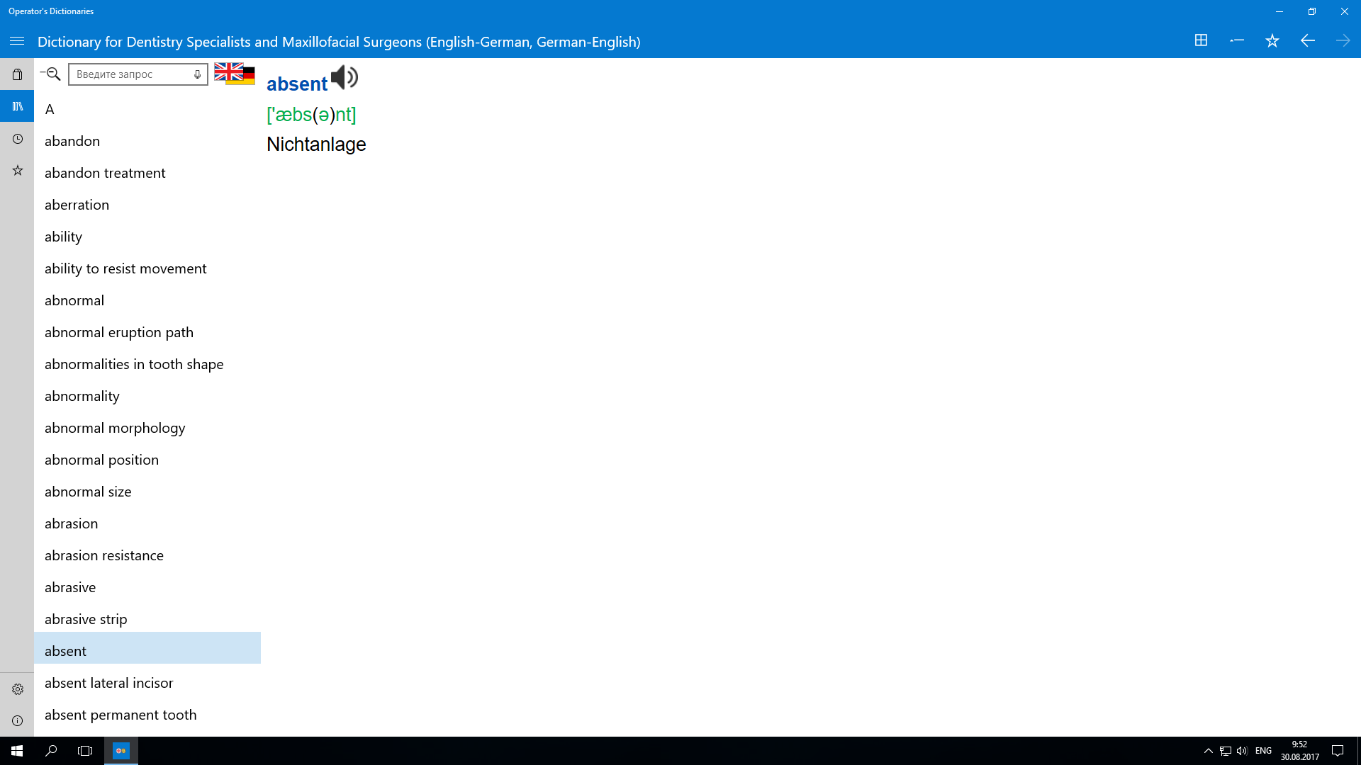 Operator’s Dictionary offers to a specialist in dentistry and maxillofacial surgery a wide selection of words, collocations and phrases starting with common vocabulary and ending up with highly specialized terms. Practically all lexical units have two versions of transcription and a sound file. Alphabetical and full-text search allows to find in a fraction of a second single words and phrases as well as to make contextual selections from all the dictionary contents.