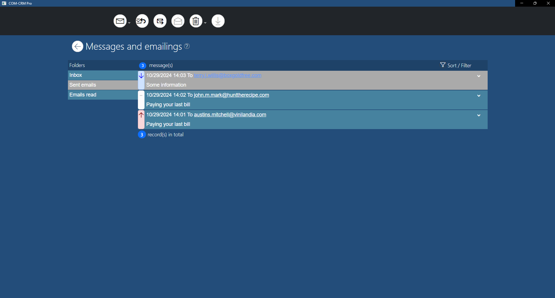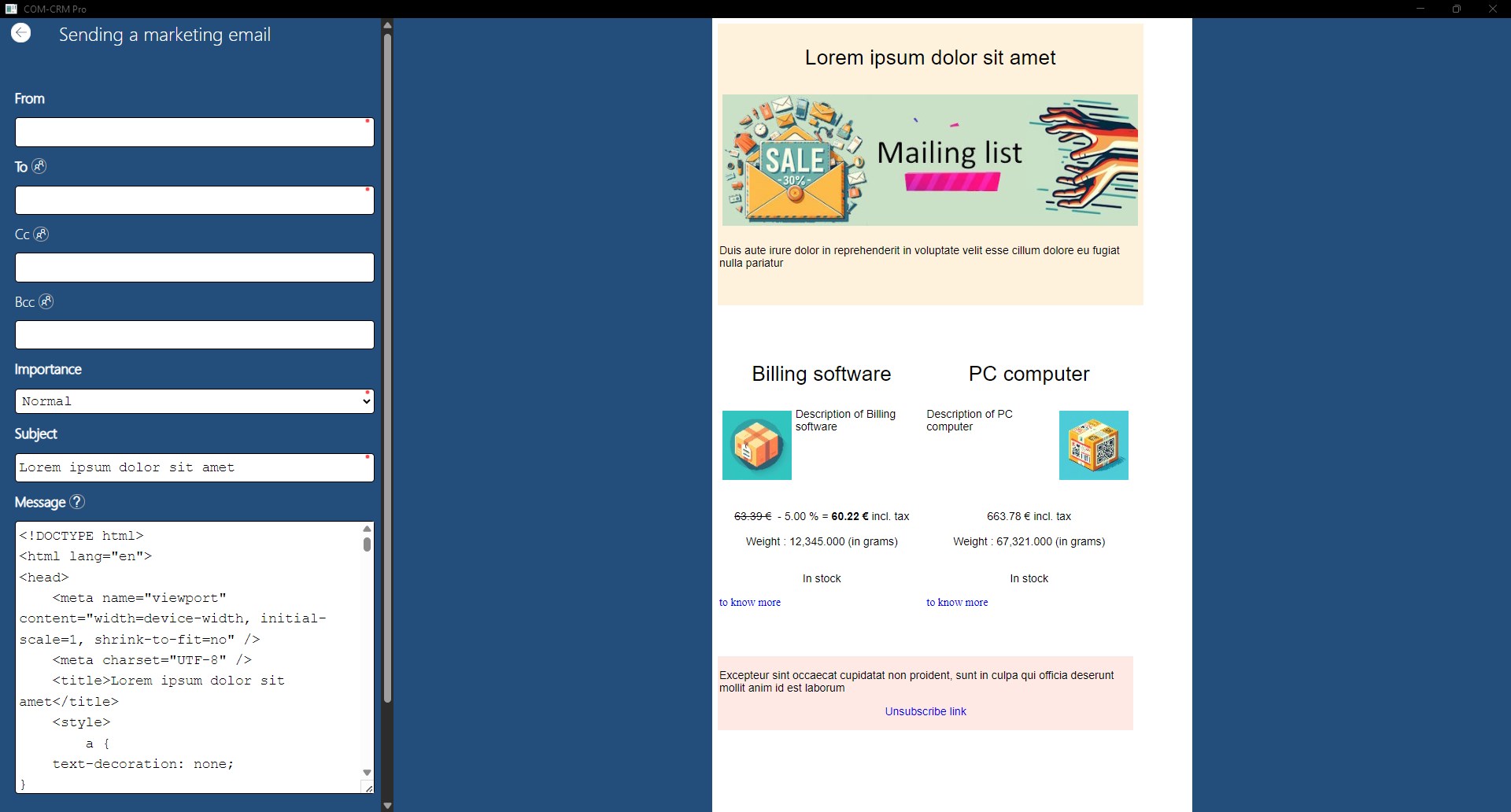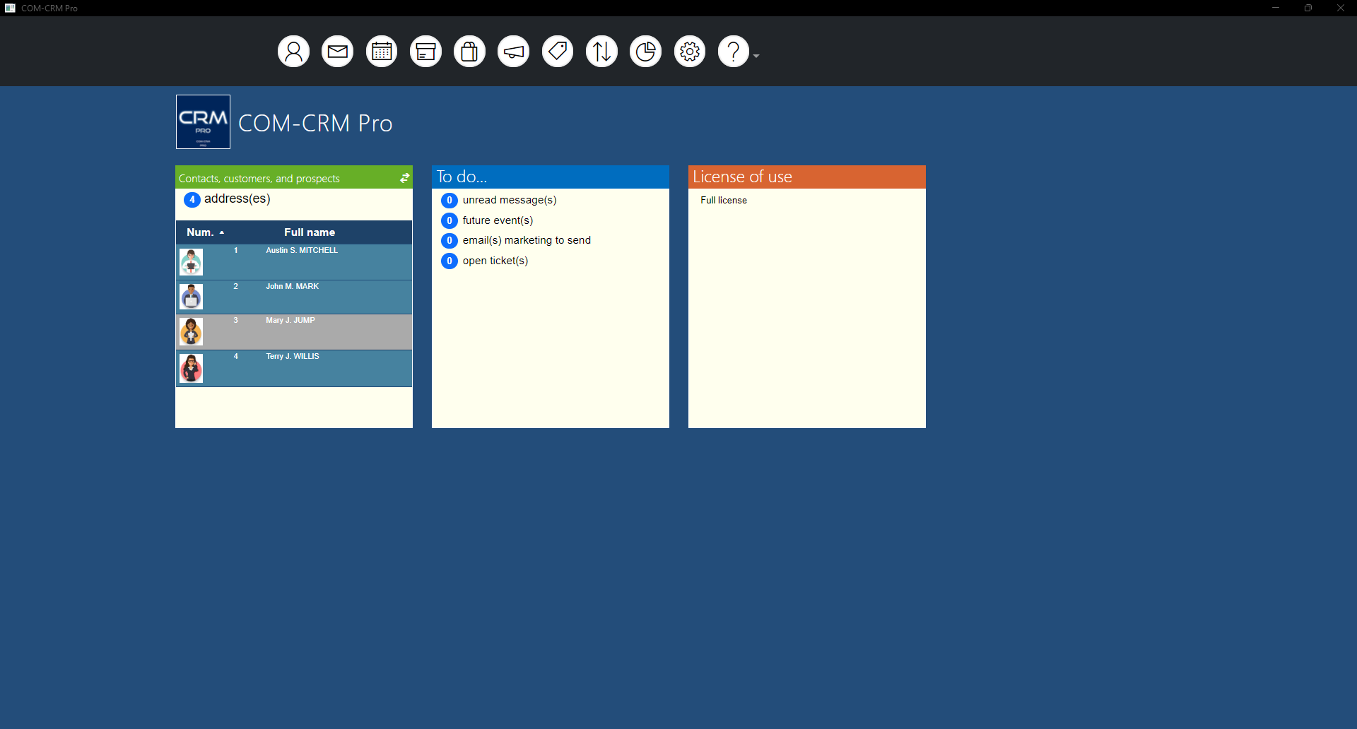 contacts (prospects, customers or simple contact) with photoemails and emailings sent to the contactsappointments and phone calls in a calendarproducts with description, price, discount, margin and photoquotes and orders sent to the contactsability to send and receive emails through SMTP and IMAP serversimport and export events in iCal formatimport and export addresses in vCard formatimport and export products in CSV formatexport of the data of sale in CSV formatimport of addresses extracted from business cards with the COM-SCAN applicationexport localized addresses to the COM-MAP and COM-MAP Top applicationsemails archivingwhen creating an event, sending an email inviting the concerned person to the appointmentinvoice templateinvoice with optional VATmarketing emailing of productsmanagement of vacations and visualization in the calendar of eventsuse Microsoft/Outlook account to send/receive emailssave/restore database easily from/to OneDriveinvoice in HTML or PDF