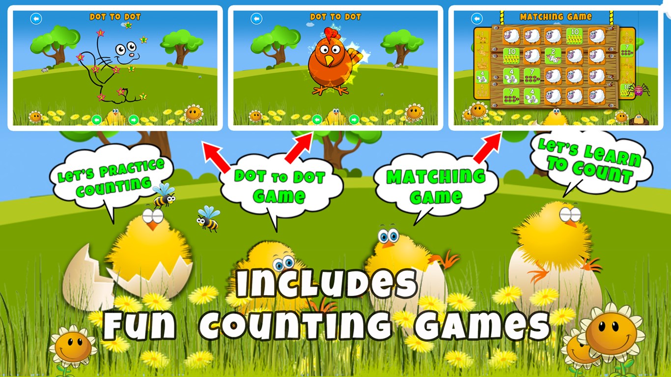 Designed for early childhood learning numbers.Interactive learning mode - Count up as well as count down.Fun, interactive practice mode.Encourage visual counting.Fun Counting GamesLearn in a fun environment complete with cute graphics, animation