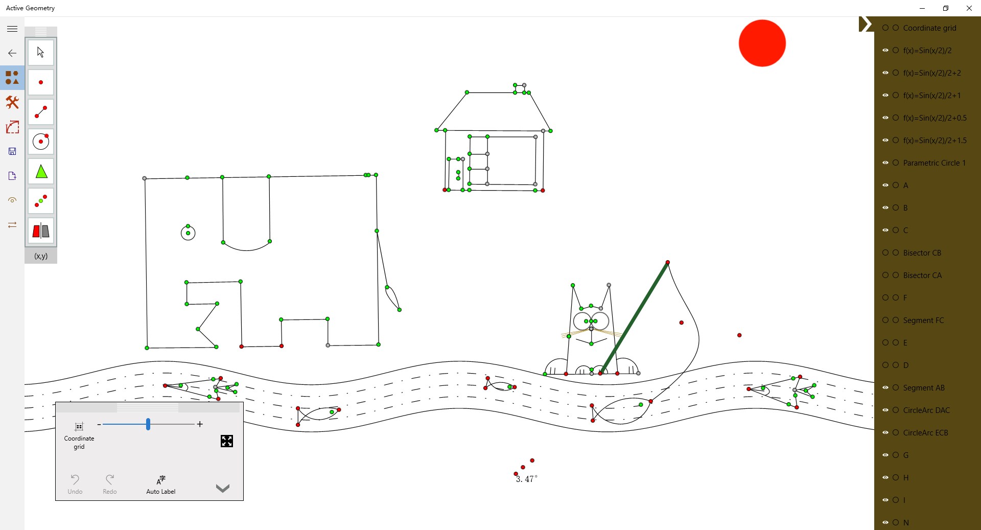 "Active Geometry" application can draw geometry and function graphics, can replay the creative process, and exchange. By points, lines, and other basic tools, you can customize the graphics tool, to quickly build complex geometry, plus the function graph, to draw a wonderful world of geometry.