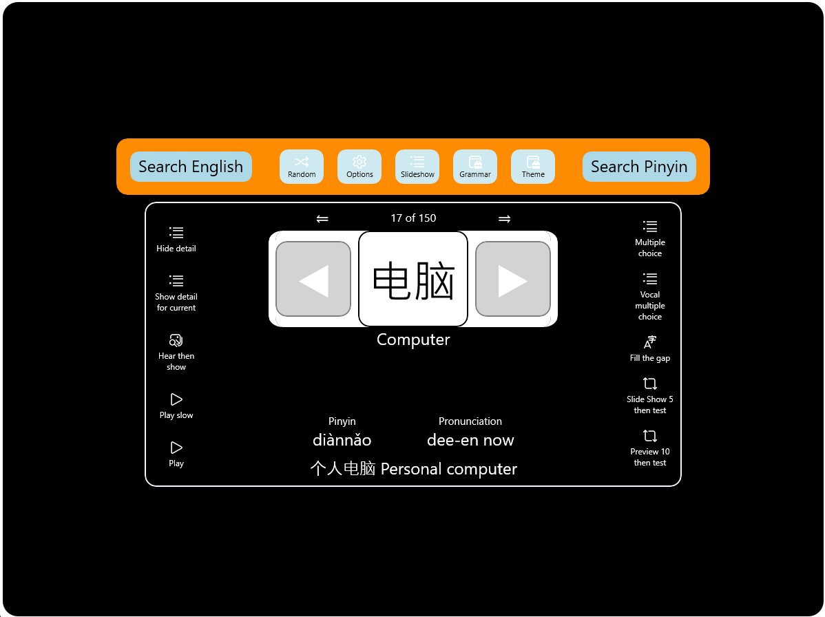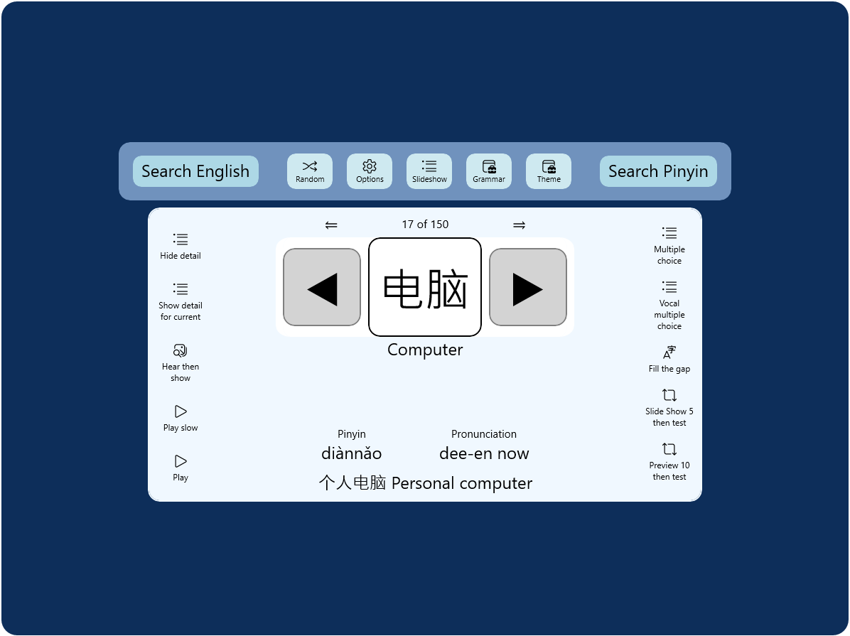 Flashcard style interfaceEnglish translation, pinyin representation, pronunciation and sample phraseIntroduces the HSK level 1 150 characters and phrases.Powerful search by English words, pinyinTwo quiz features to cement you knowledgeSelf contained, no need to install any Chinese fonts language packsCompletely offline. Practice and learn anywhere!Grammar section