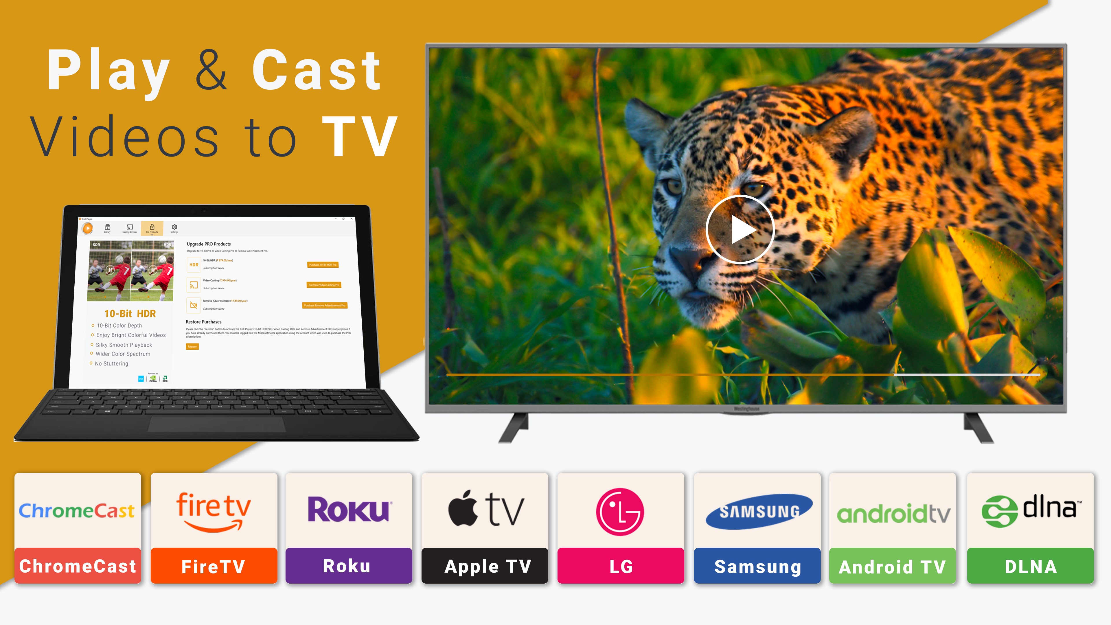 HDR 10 BIT VIDEO CODECS [PRO]: Highly Optimized 4K 10bit HEVC, H.264, AV1 and VP9 for a breath-taking playback of HDR videos with wider color spectrum and TRUE HDR colors (NO dull grey colors).CAST VIDEOS TO TV [PRO]: Cast or Stream (Play to TV) videos from Windows 10 Computer to Google Chromecast, Roku TV, Apple TV, Amazon Fire TV, Android TV, Samsung Tizen, LG Web OS, and DLNA Smart TV.MODERN USER INTERFACE: New design with a smooth user experience.MULTI LANGUAGE SUBTITLES: All language subtitle player: Supports all subtitle formats (ASS, SSA, SRT, PGS, SAMI, Subrip & more) with enhanced settings to change size, color or alignment of subtitles.VIDEO FILTERS: Adjust Video Saturation, Contrast or Brightness for personalized visual experience.PLAYBACK SPEED CONTROL: 0.5x to 2x video playback experience, in case you want to learn from video or quickly watch video.FILE FORMATS: EXTENSION: AVI, MKV, MP4, Webm, TS, PS, XVID, FLV, MOV, QT, MXF and many more.CODECS: AV1, VP9, VP8, H.265 (HEVC, x265), H.264 (AVC), VC-1, WMV, MPEG-4 & MPEG-2.AUDIO CODECS: AAC-LC, HE-AACv1, HE-AACv2, MP3, MP2, MP1 and Ogg Vorbis.EXCELLENT VIDEO MANAGEMENT & ACCESSIBILITY: Add or delete custom video folders to library