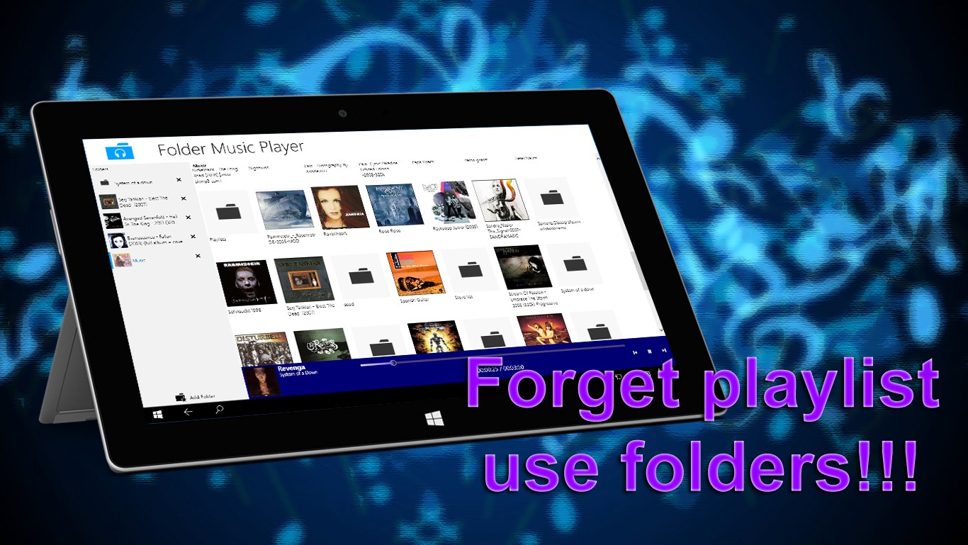 MFPlayer is simple music player that uses folders as play lists. Just tap on any file inside the folder and whole folder will be used as playlist.