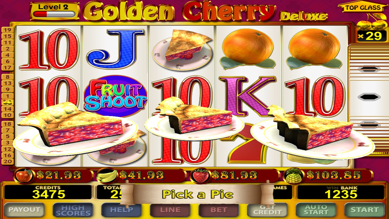 Features amazing graphics and sounds. Get 3 or more pieces of pie to activate the feature / Bonus picker. Bet up to 20 lines or play the amazing Golden Cherry Deluxe reel for really BIG prizes. All wins can be gambled on a true odds multiplier card gamble. Win one of 4 live progressive pots!