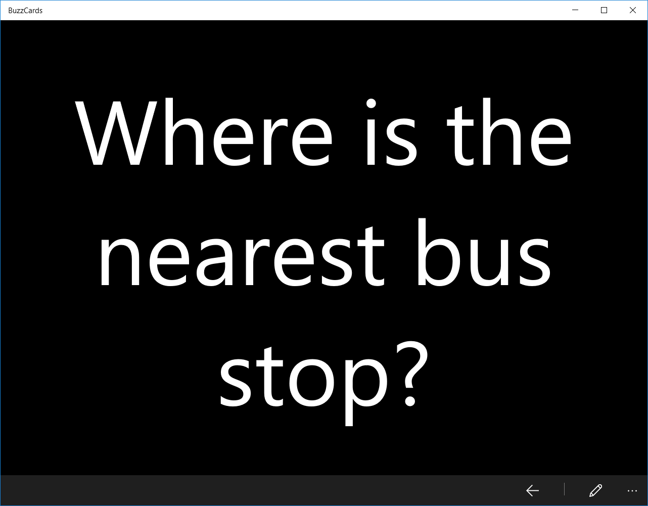 You can write and save cards with the messages you use the most. For example, “Where is the restroom?” or “Where is the nearest bus stop?” You can also make or edit cards on the fly, as needed. The cards are organized by category - for example, “Dining” or “Travel” – to make them easy to find. There is no limit to the number of cards you can create. The BuzzCards app makes face-to-face communication simple; just type it and show it.