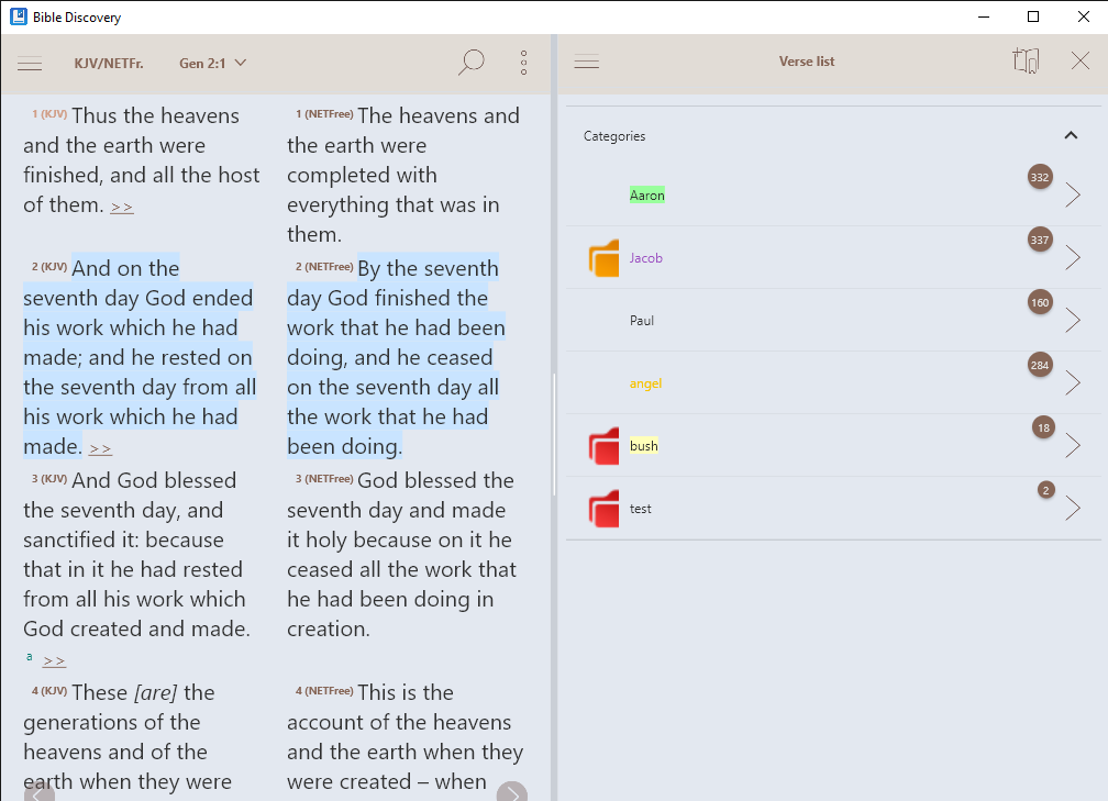 - Bookmarks can be used. The bookmarks in different categories can make the verses colored differently.