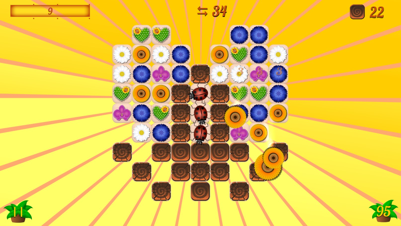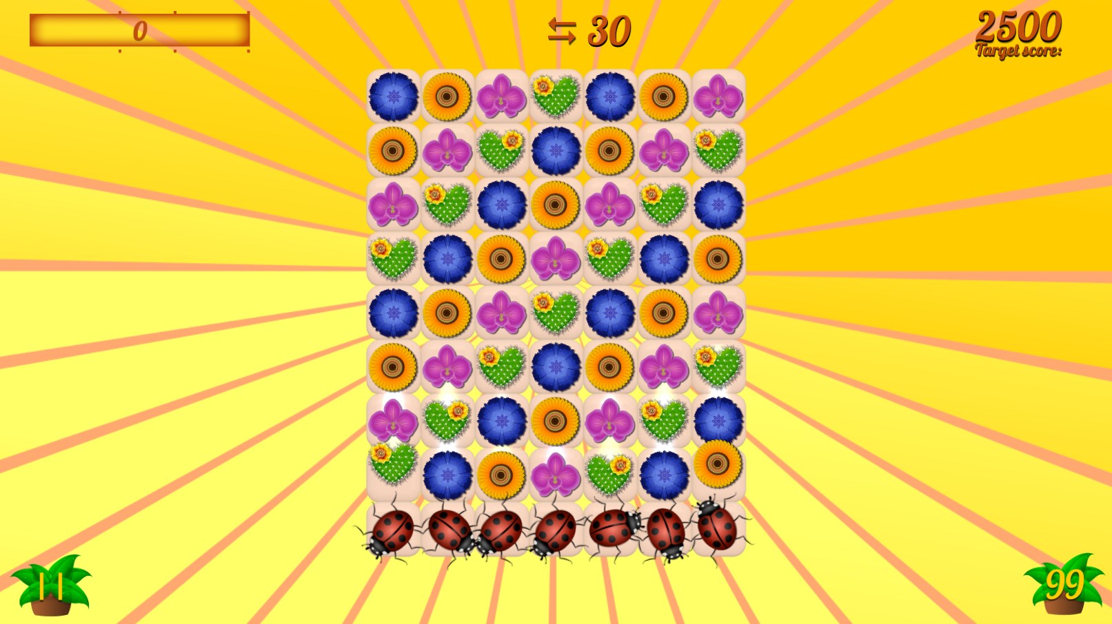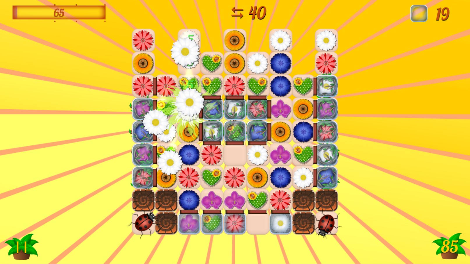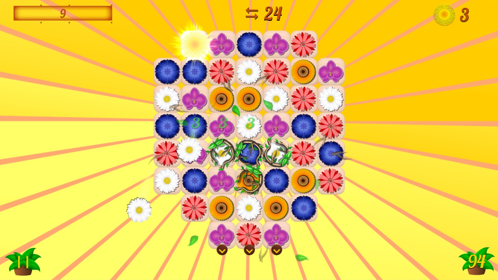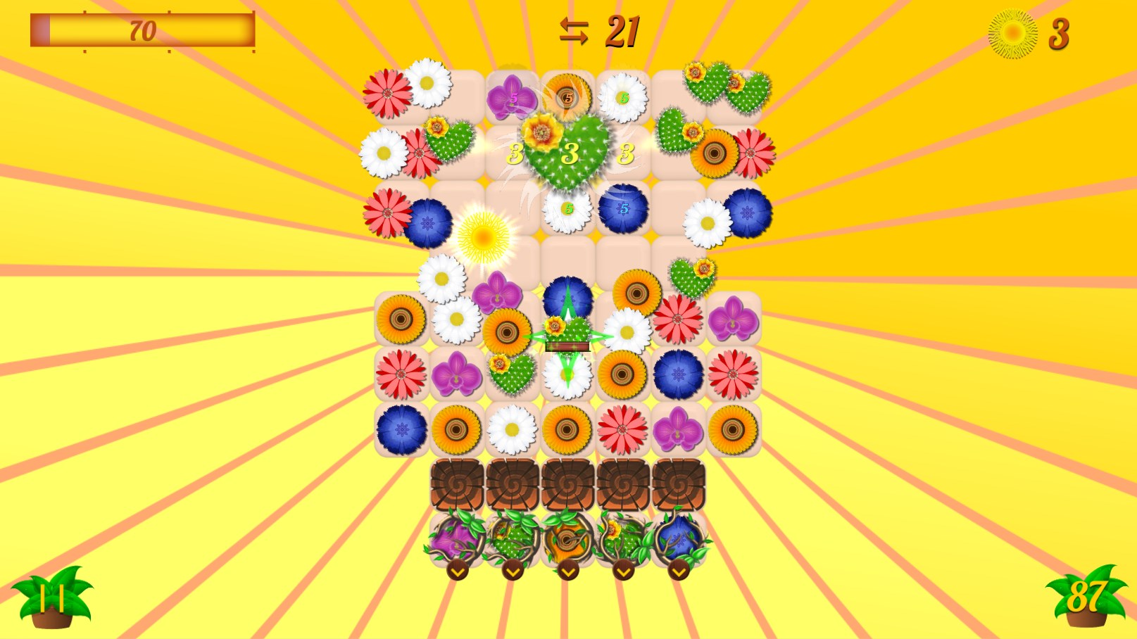 In this game swipe the flowers either horizontally or vertically to match them 3 or more in a line, T-, L-shape. Match 4 or more flowers to get the power-ups. Combine two Power-ups to get the Super Power-ups!