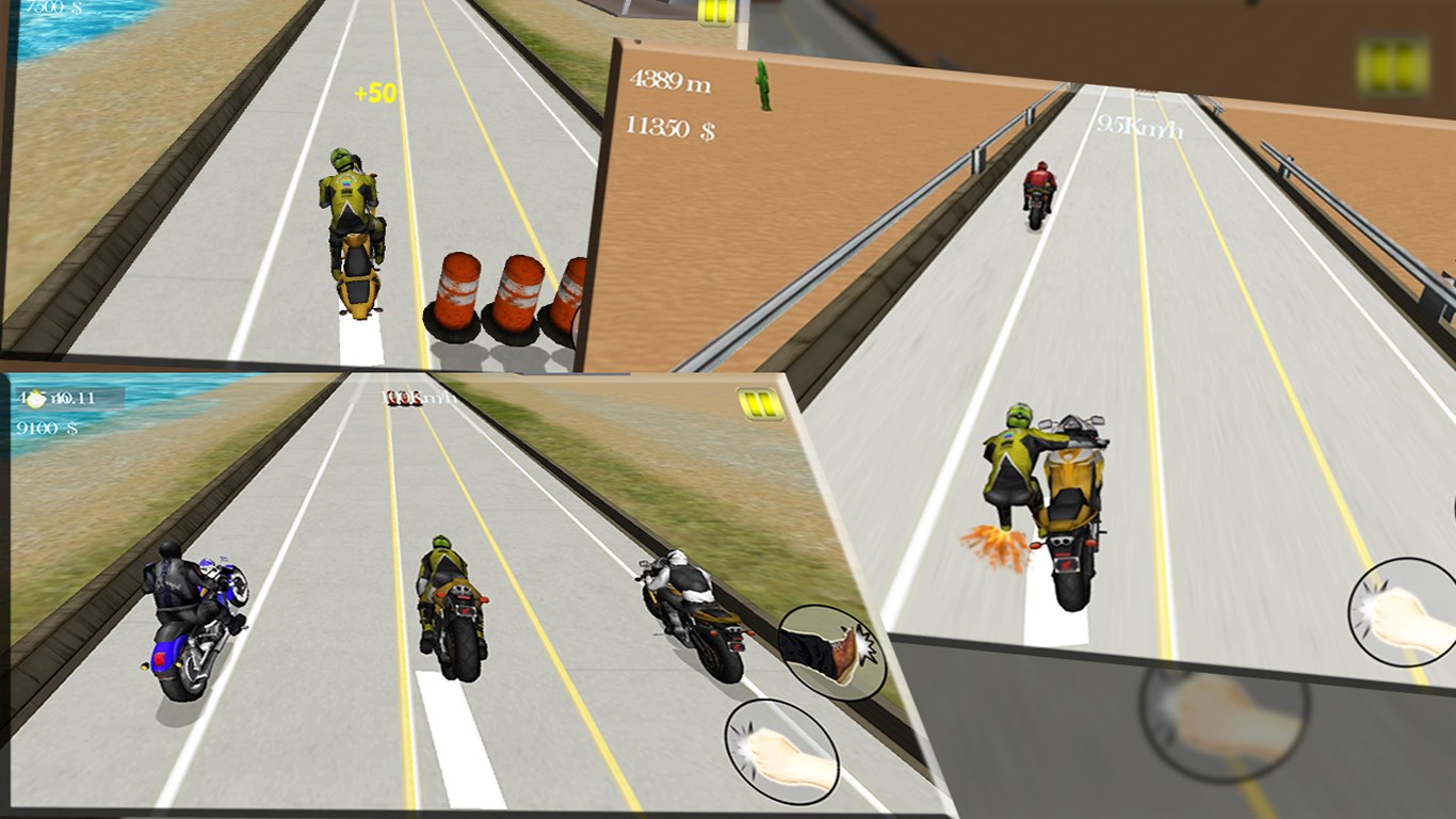 A vast collection of world class bikes like Yamaha, Suzuki, Ductai etcDifferent characters to choose from. Every one of them has unique abilitiesRealistic physics throughout the game.HD graphics Addictive gameplay Easy controls3 modes to play: knockout, free ride, time mode