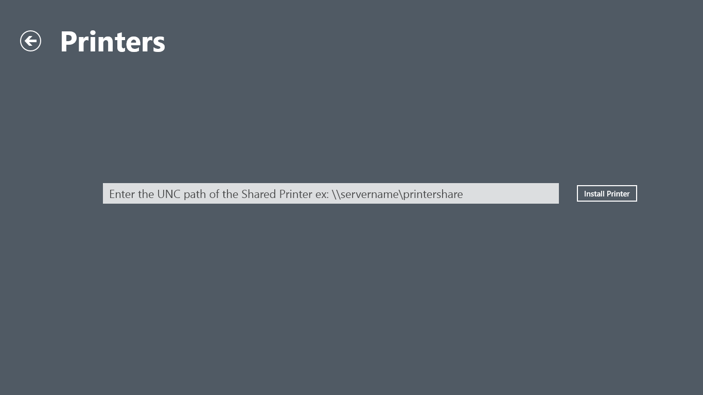 12. Finally open the Printers Page. From here you can enter in a UNC path to a printer, select “Install", and this will initiate the installation of the shared printer on your workstations.