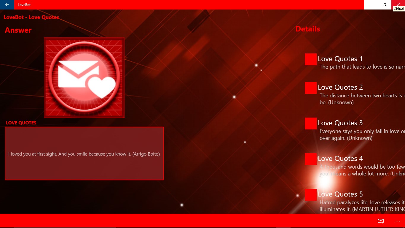 COMPATIBILITY: get the love match between you and your partnerQUIZ: fun love and relationship quizzes to help decode your love life!CUTE LOVE QUOTES, APHORISM, SAYINGS: share the best love quotes collection by famous authors, poets, philosophers and moreDATING: play and listen to multimedia presentations of your love consultant to learn and improve the way you relate with the person you\'re in love (how to kiss, french kiss, ...).GIFT IDEAS: everything you need to find the perfect gift for him or her.LOVE HOROSCOPE: find out what the stars have in store for your love life and relationship today!