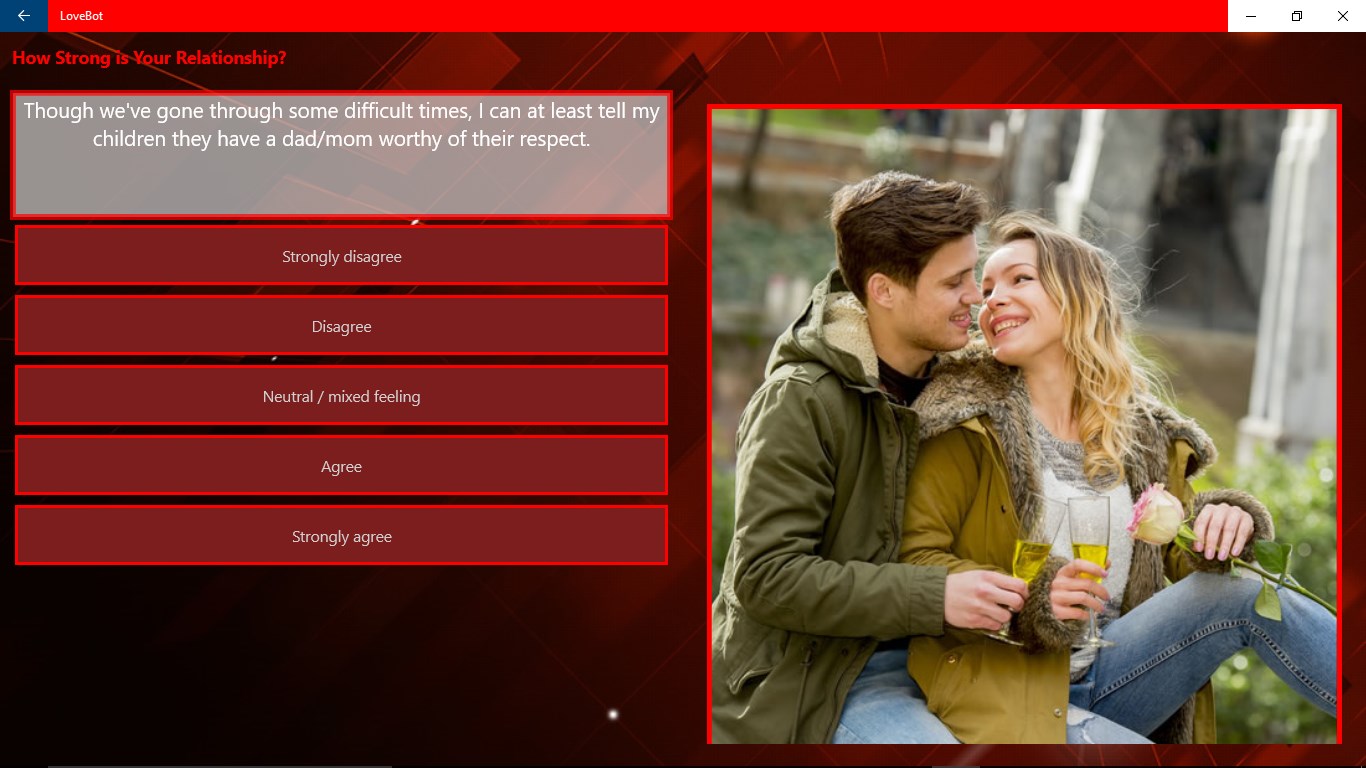- Relationship Strong. This test gives you some idea about the strength of your long-term monogamous relationship or marriage.