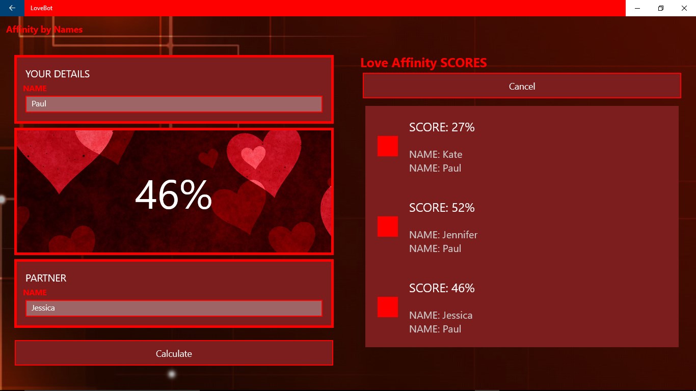- compatibility by Names: Enter the names and calculate the couple affinity