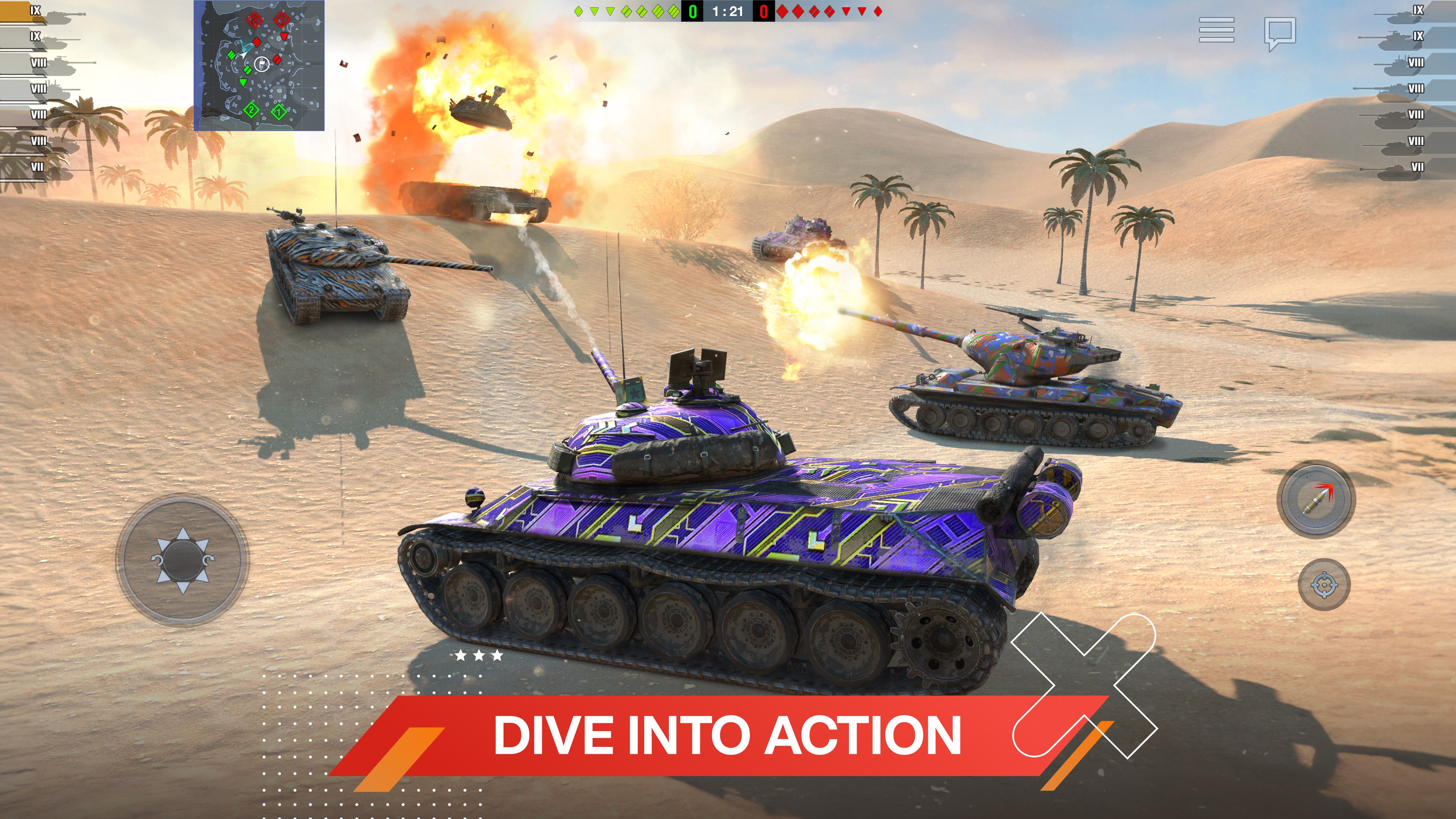This PvP shooter is automatically optimized for your device. Get the most out of driving exciting tank models, and watch turrets blow off spectacularly and go flying around the battle arena against a background of exploding vehicles. Tweak the settings to find the ideal balance between fantastic visuals and high FPS.