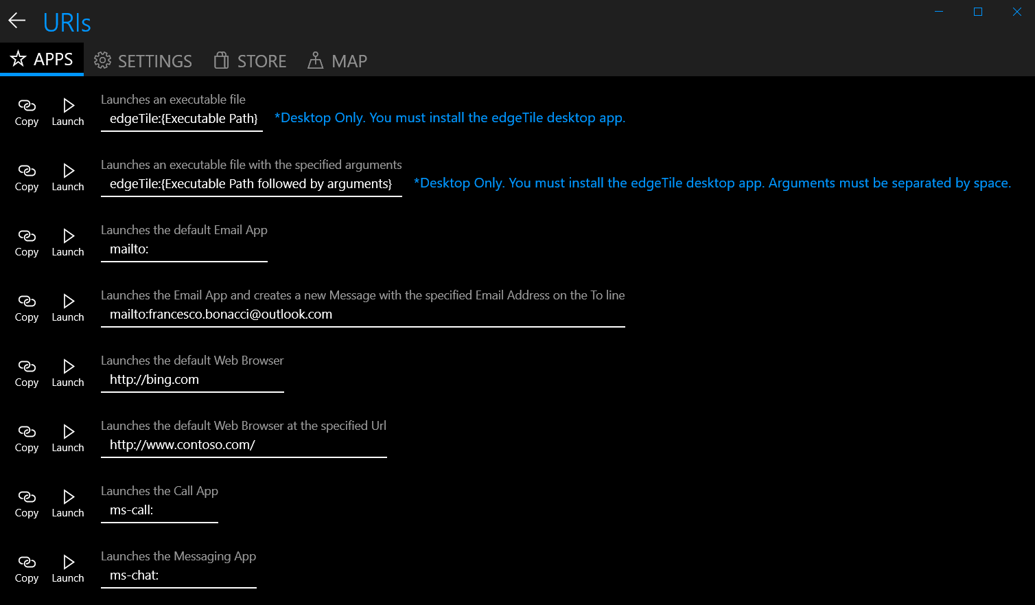 - Support for websites and apps launch through URIs (URLs and Microsoft URIs)