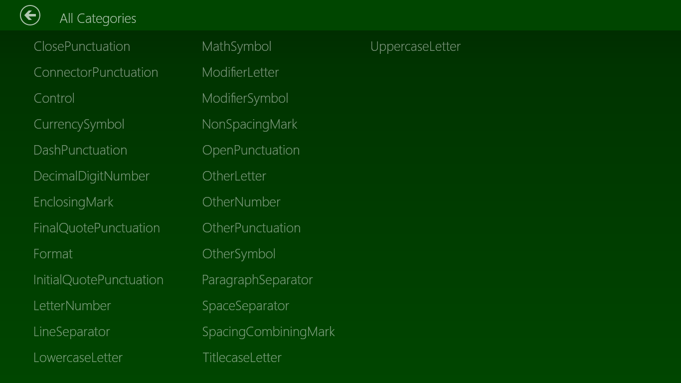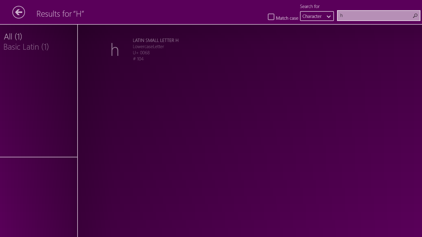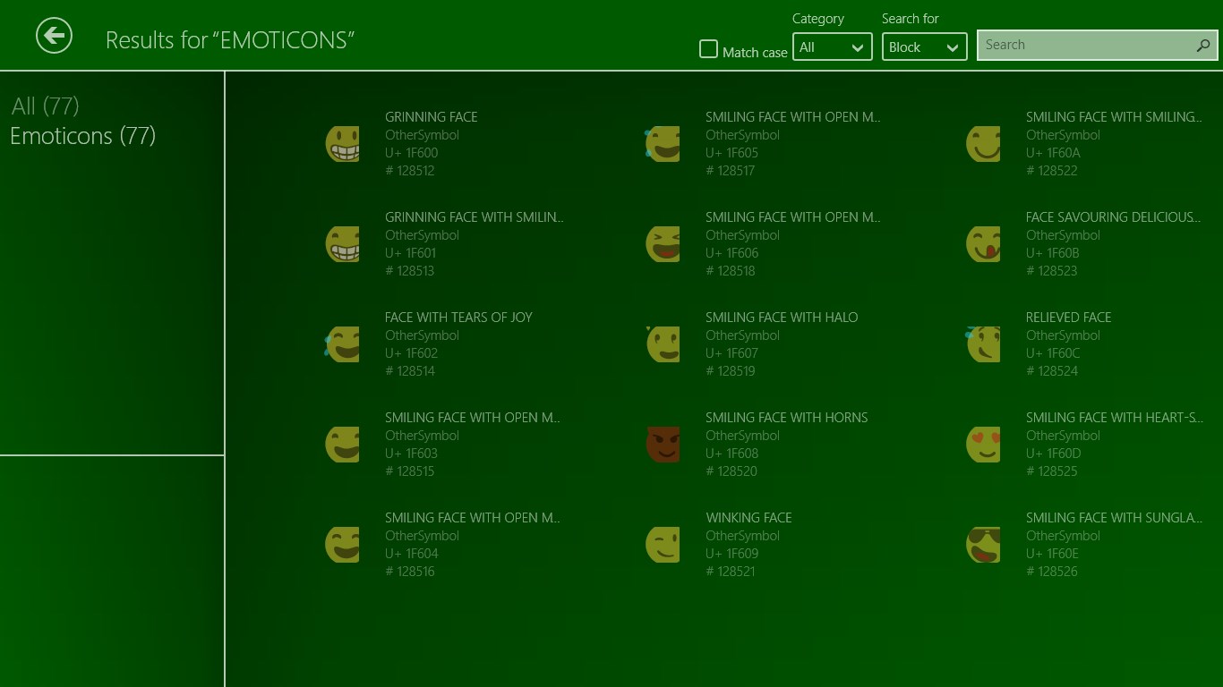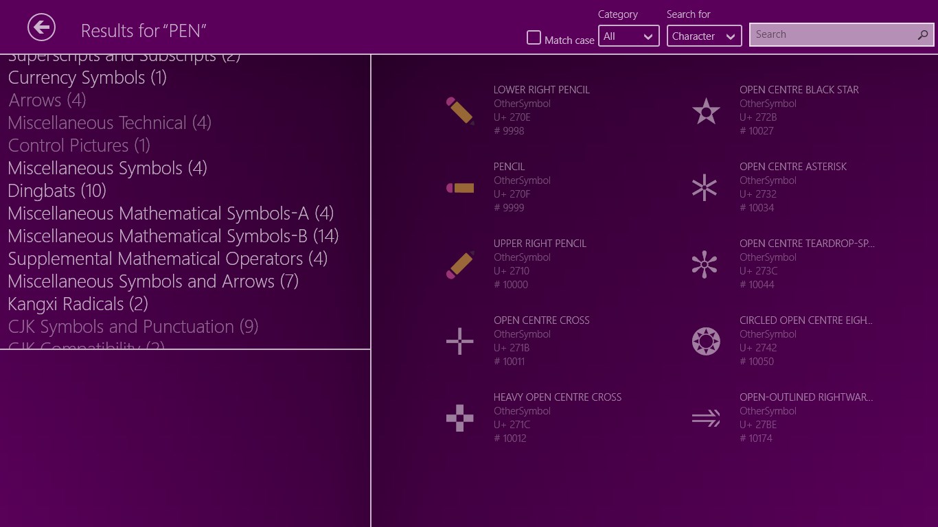 This app returns you the list of characters ( arranged by blocks ) with its name, category, other names, related characters, numeric value and Unicode code in hex and decimal.
