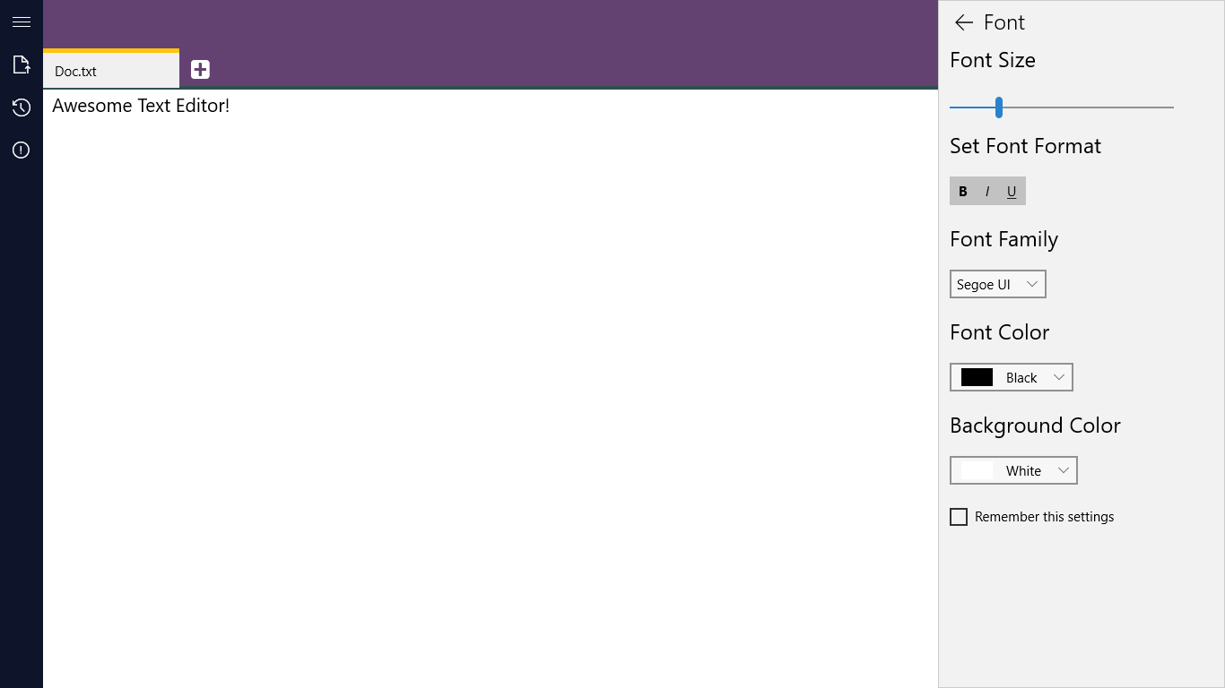 Text Editor.Open and save text files.Customize settings for fonts like font family, size, colors and more!Customize Text editor background color.List of recent files on Homepage.Options for finding and replacing text.Printing Document Support!Share Document content to other apps.Touch support, Keyboard shortcuts support.Supports for both landscape and portrait mode.