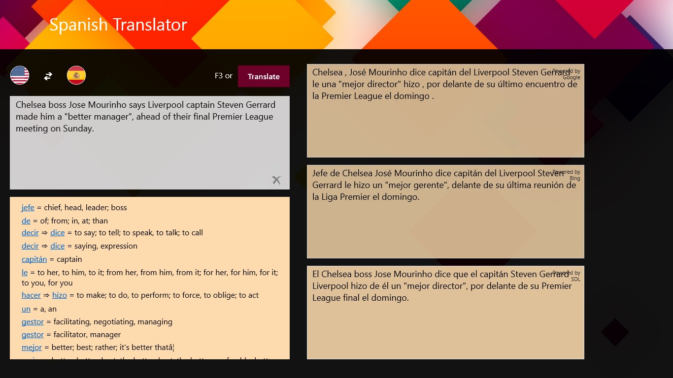 This free app is able to translate words and texts from english to spanish, and from spanish to english. It's very useful app for easy and fast translations, which can be used like a dictionary.