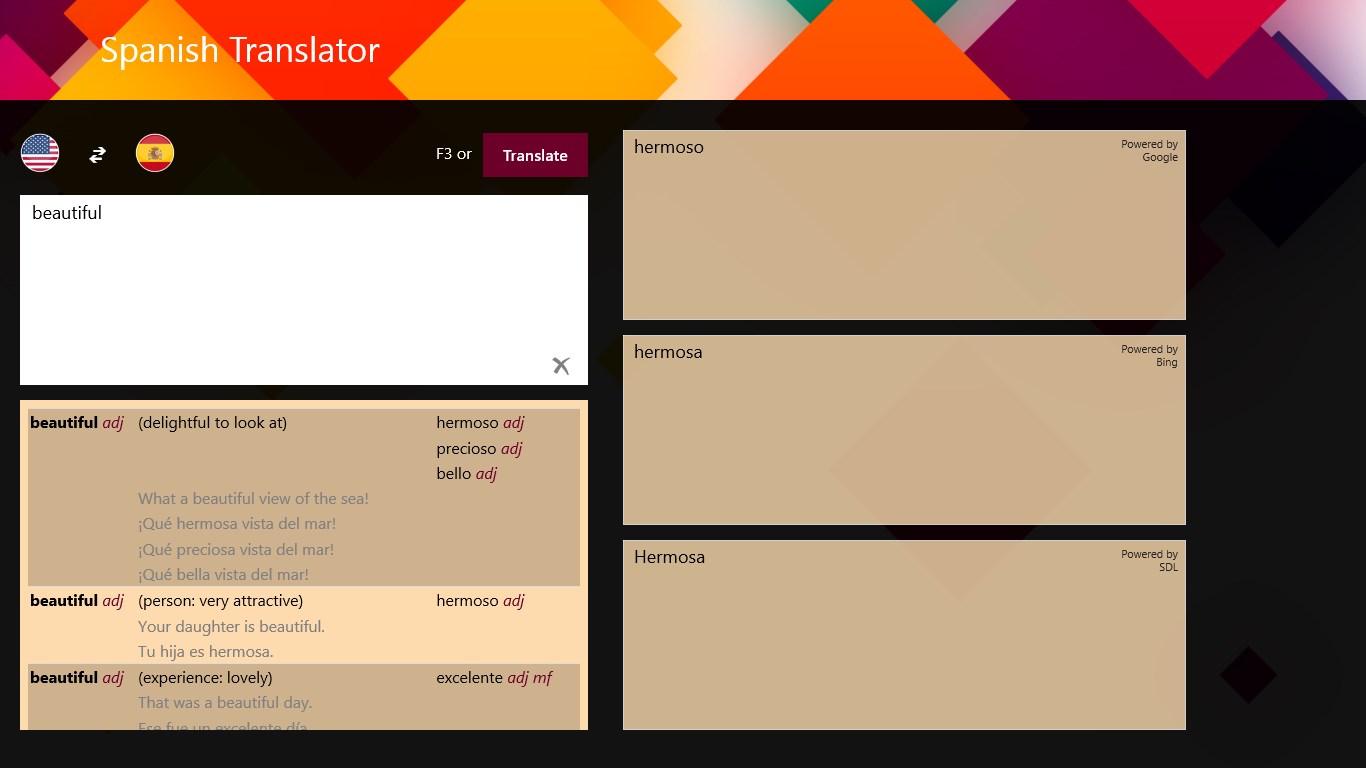 Full Spanish-English dictionary with examples, regional usage, and contextual information.Simply type the phrase that you want translated and receive two translations.