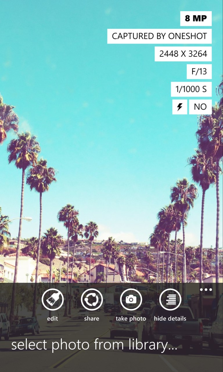 OneShot combines real-time photo effects with photo editing. It containts a fully featured photo editor that allows to edit effects of existing photos and to undo effects of photos that have been taken by OneShot