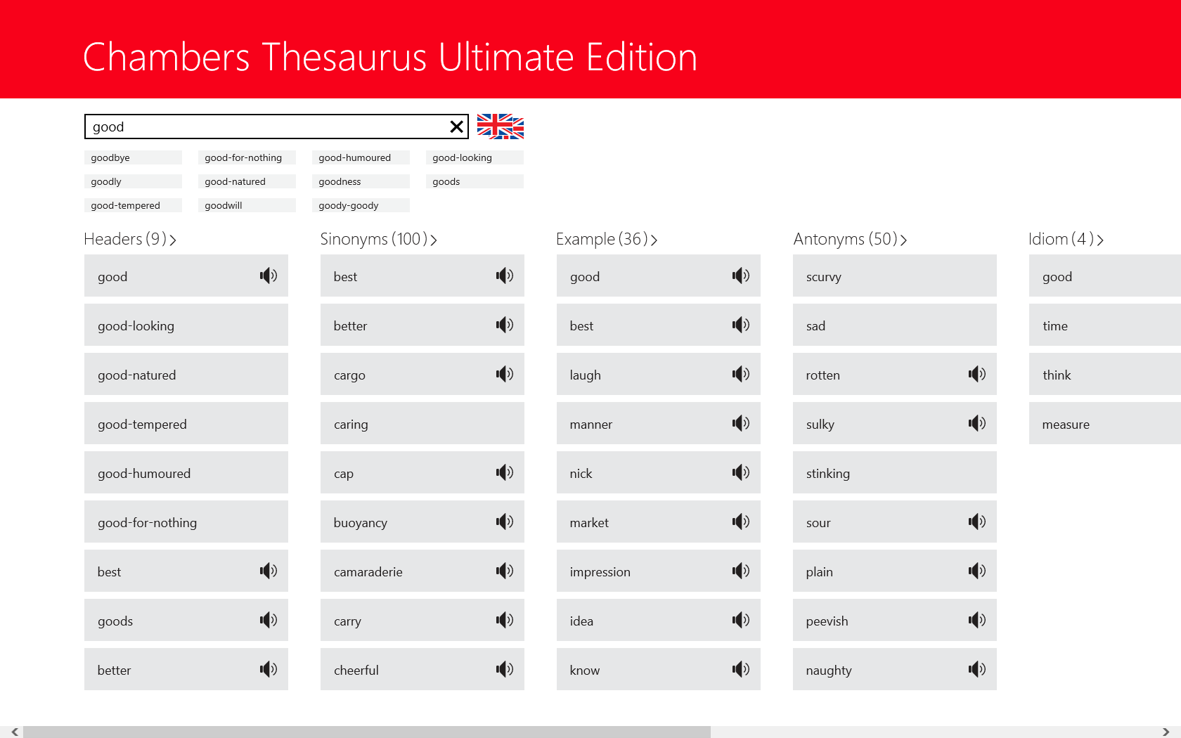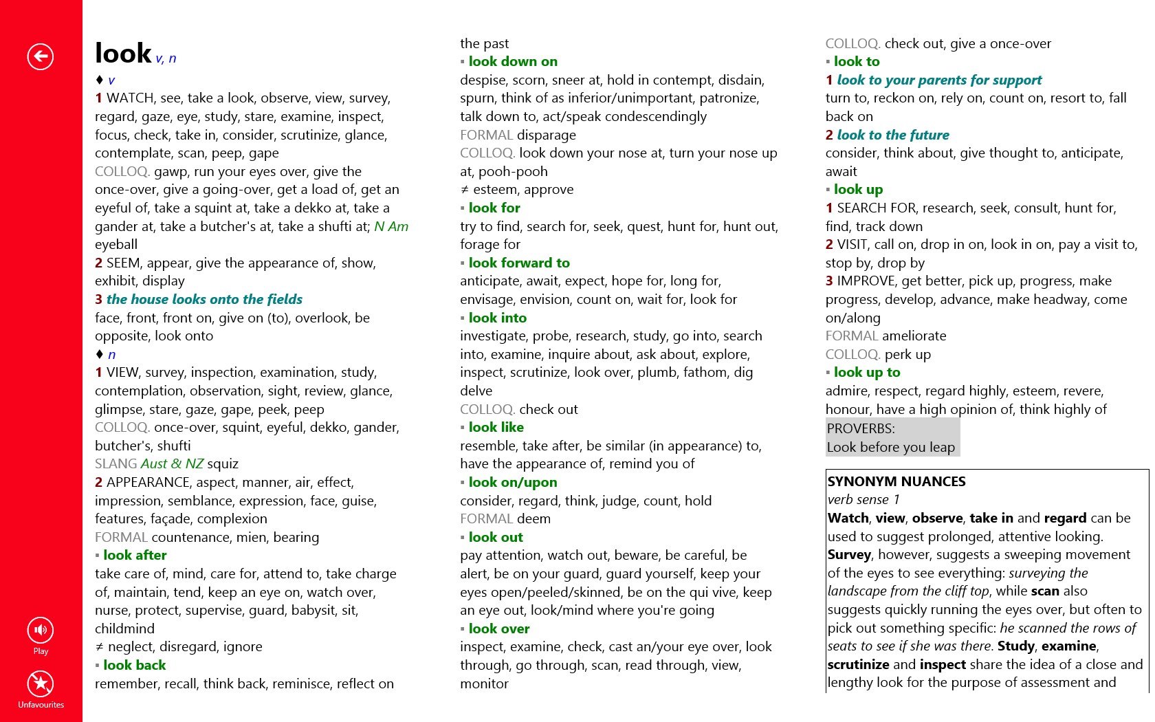 • Full text search allows you to look up words more efficiently throughout the whole dictionary content, including headwords, idioms and usage examples.