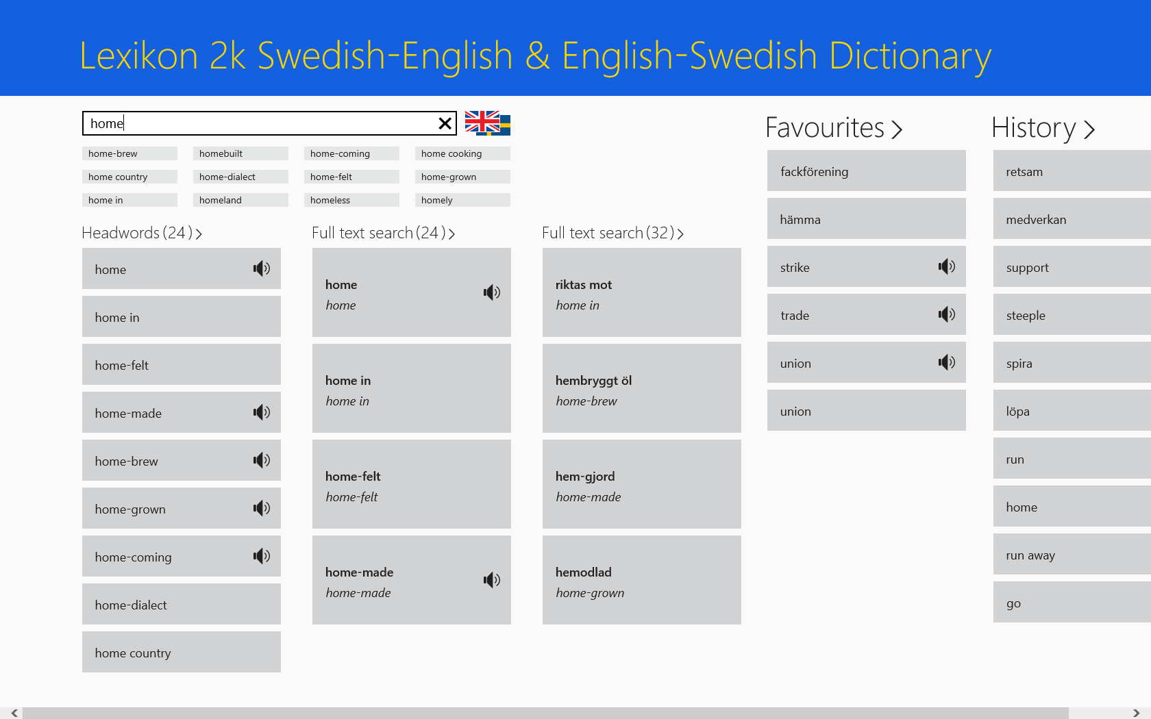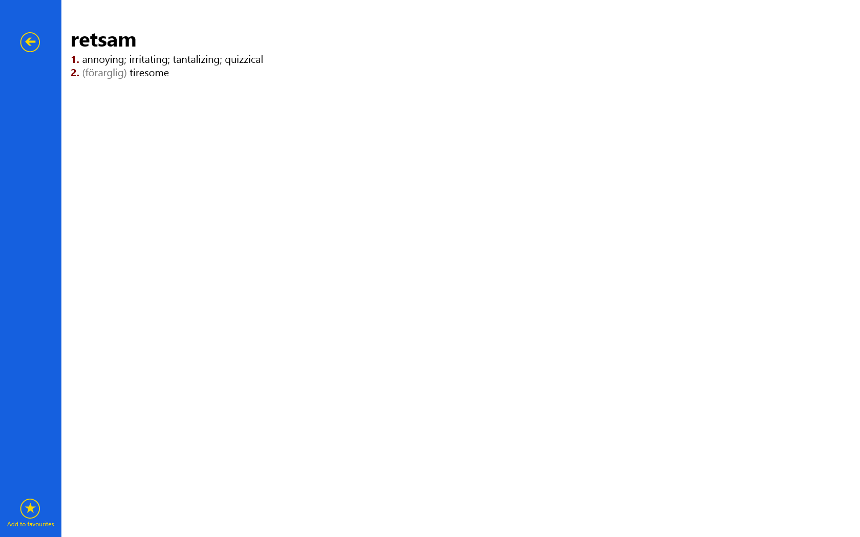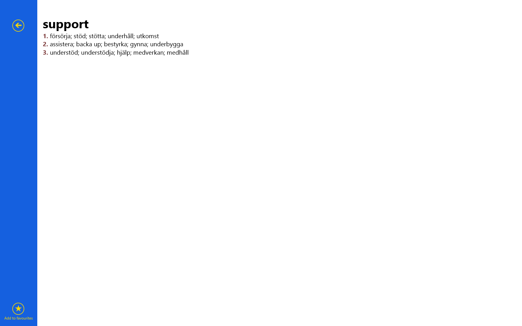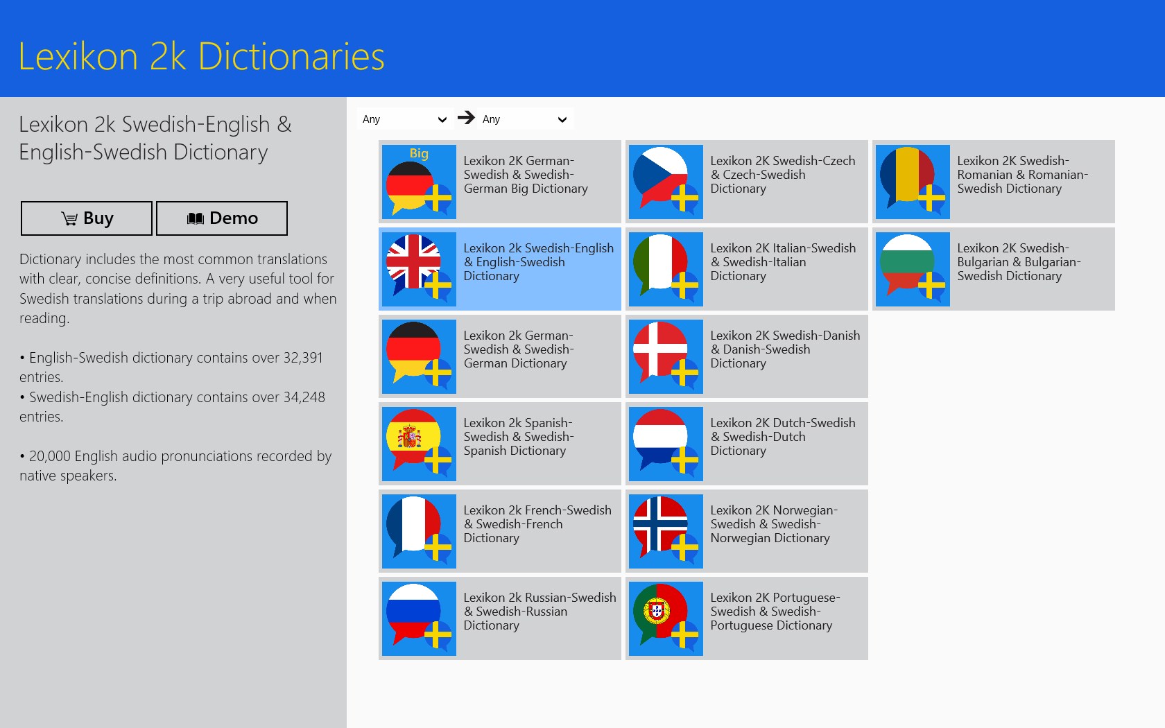 The app contains fourteen well-known Swedish bilingual dictionaries for English, German, Spanish, French, Russian, Czech, Italian, Danish, Dutch, Norwegian, Portuguese, Bulgarian and Romanian languages and allows to experience the most advanced search, learning and translation features.