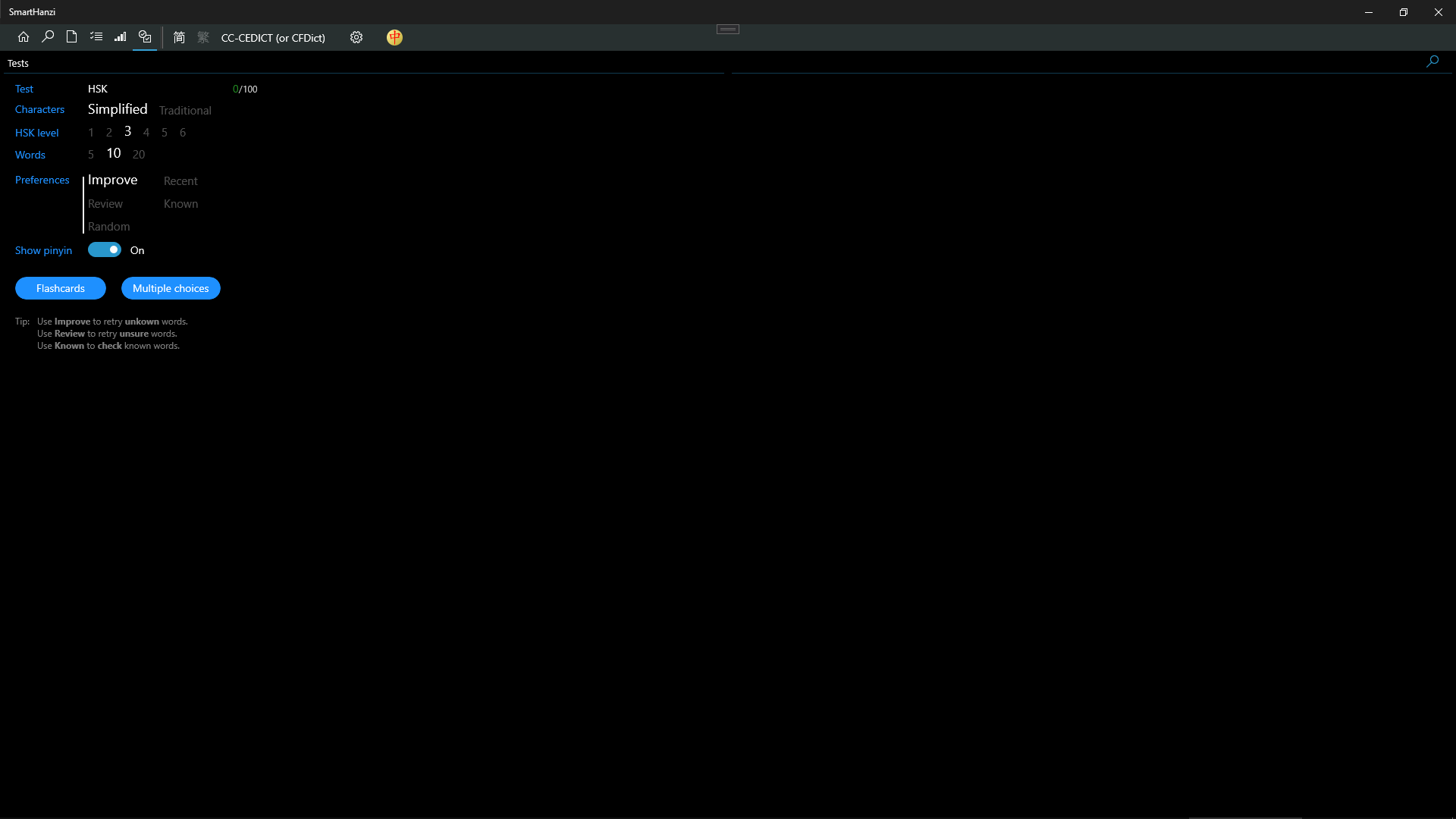 The basic option is with short tests, mistaken results retried first. Users can prefer longer tests, review unsure words or check known words. Tests are also available with traditional characters.