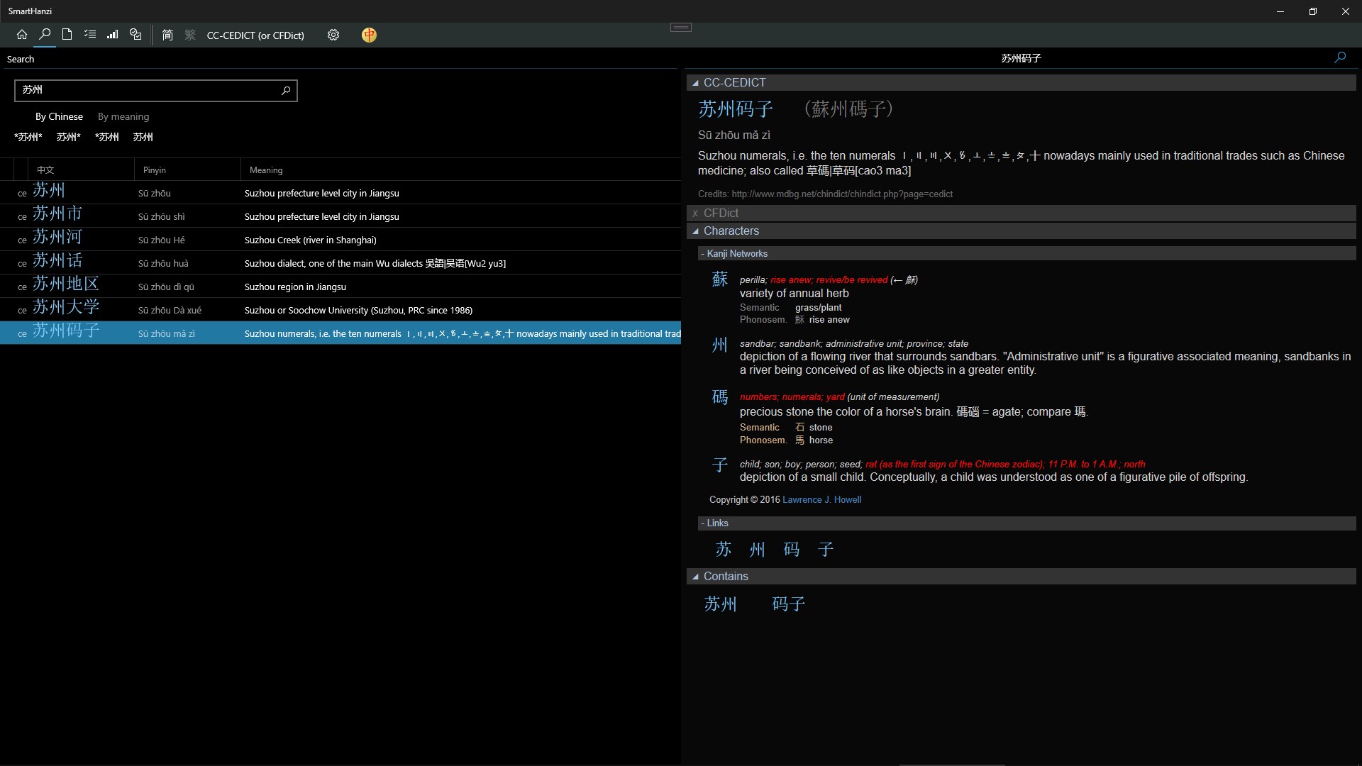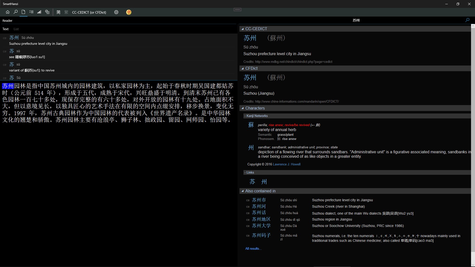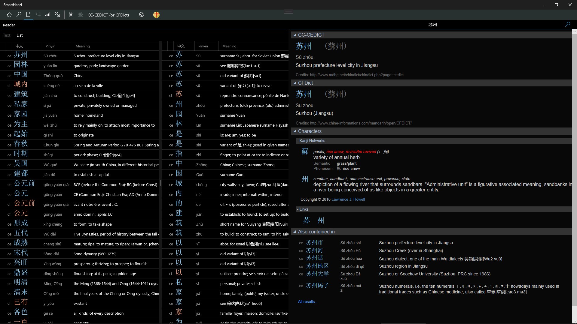 Details (lookup) can show multiple dictionaries simultaneously as selected by user, and links to related words and characters.