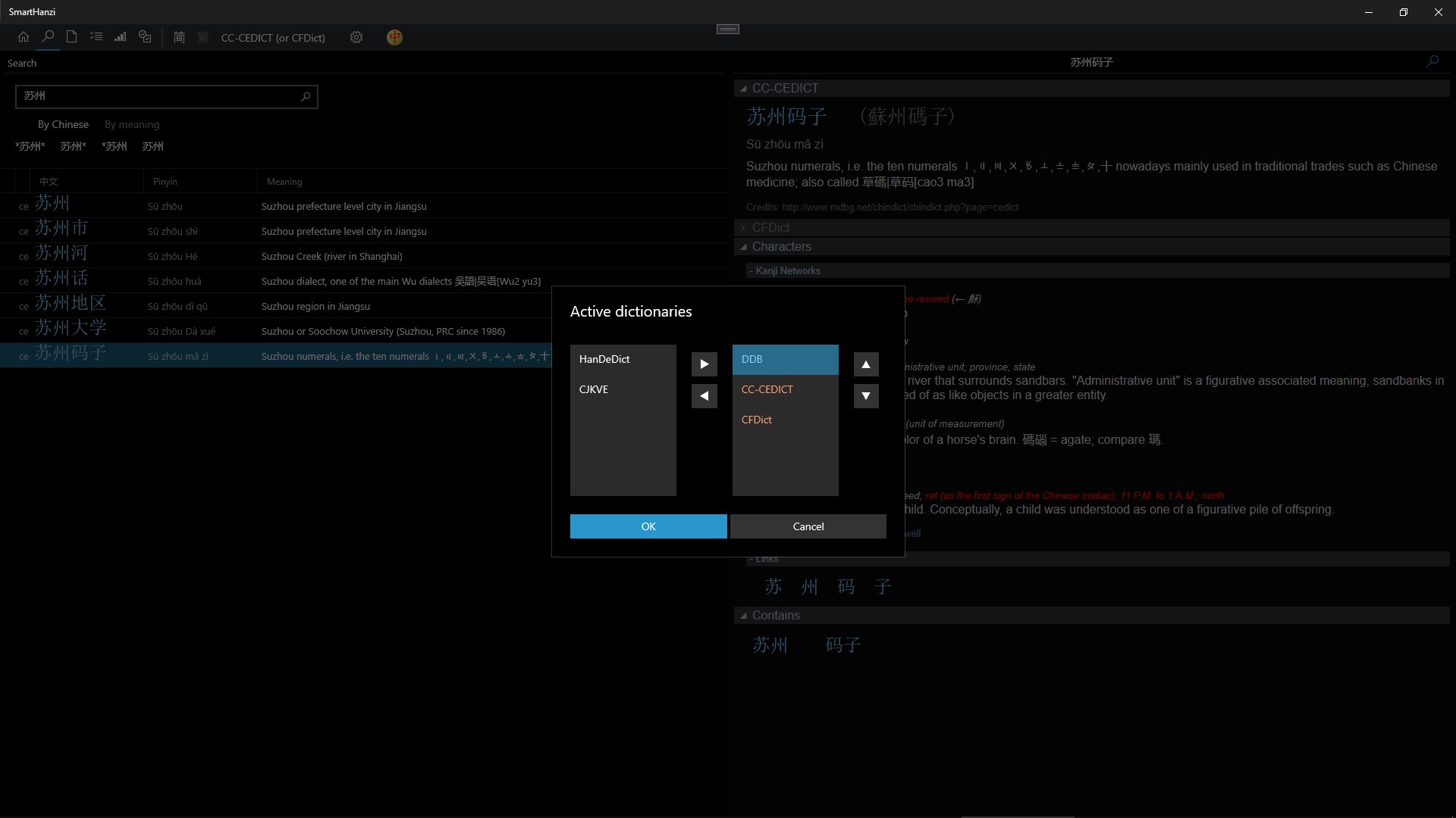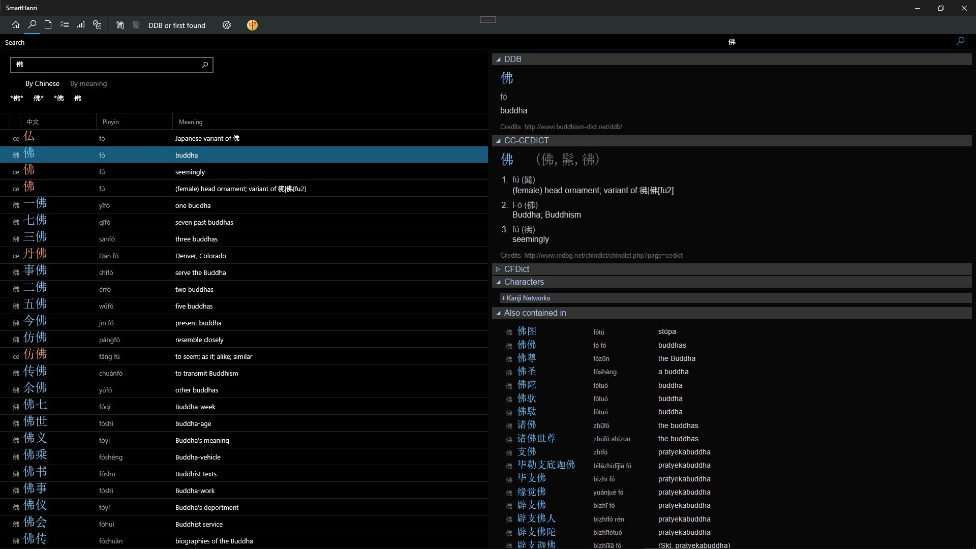 It includes standard dictionaries for English, French and German, as well as specialized dictionaries: DDB (Digital Dictionary of Buddhism, short definitions) and CJKV-E (CJKV-English Dictionary of Confucian, Daoist and Intellectual Historical Terms, short definitions).
