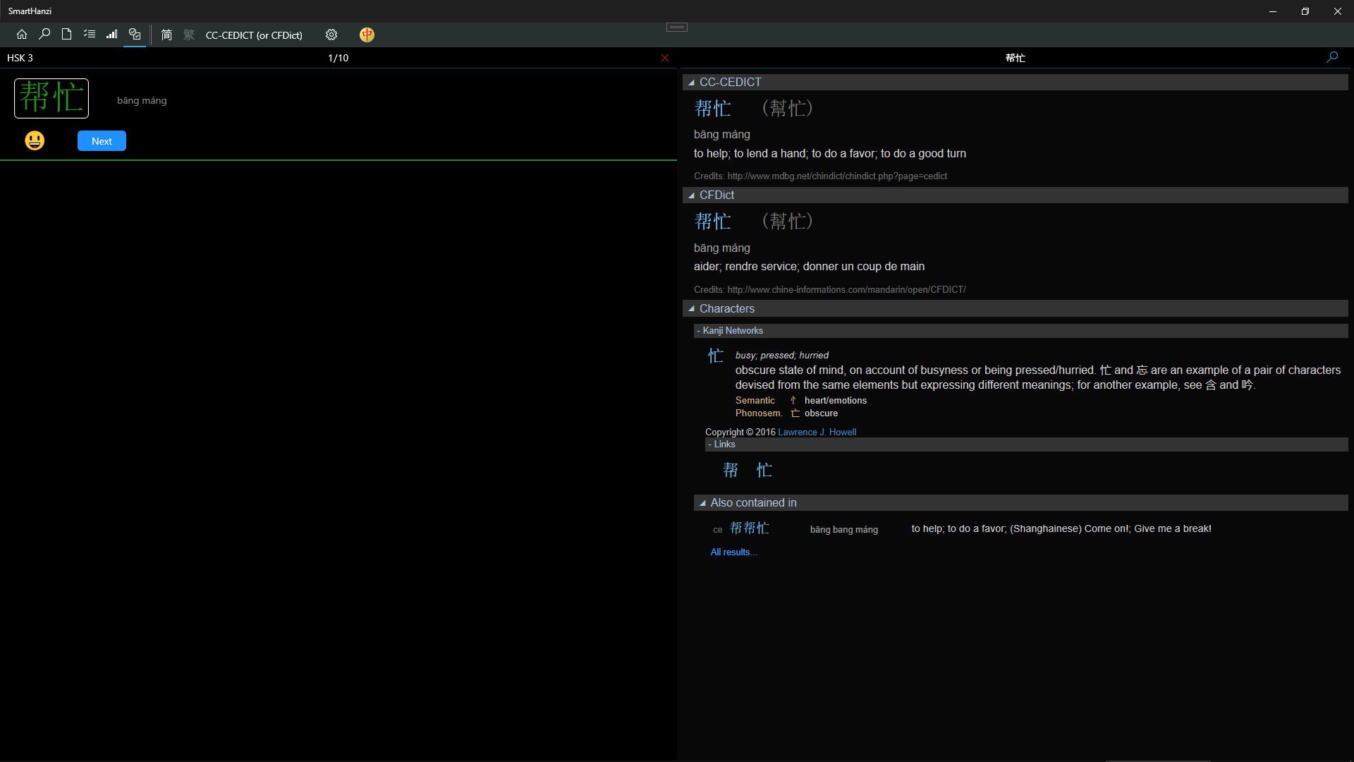 Chinese dictionary: English, French, German, DDB, CJKV-EText reader: parse and lookupFriendly tests for HSK training, progress is tracked