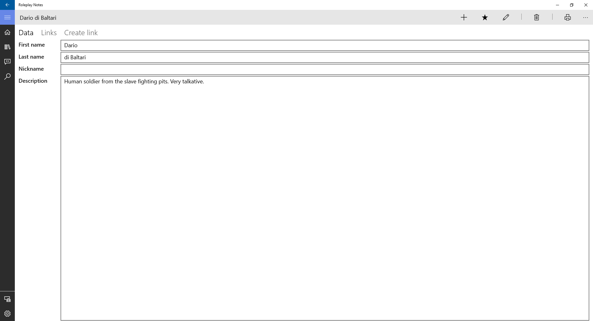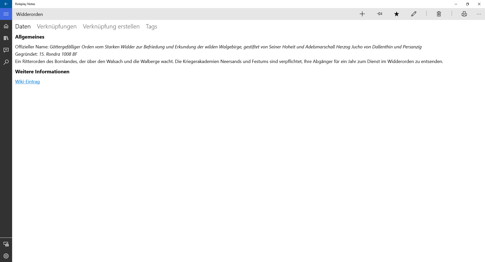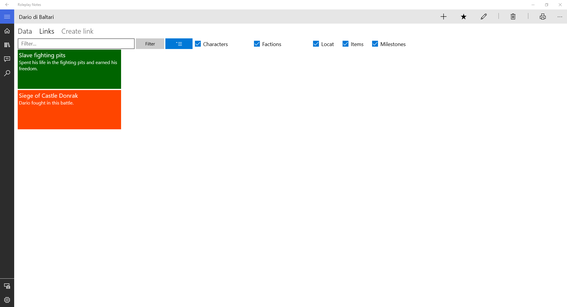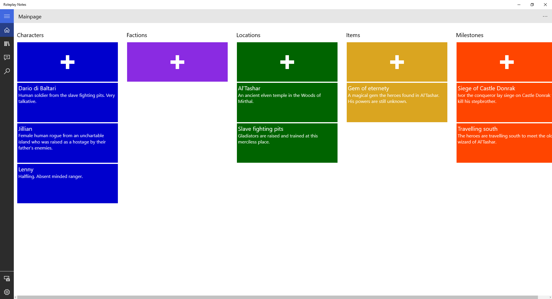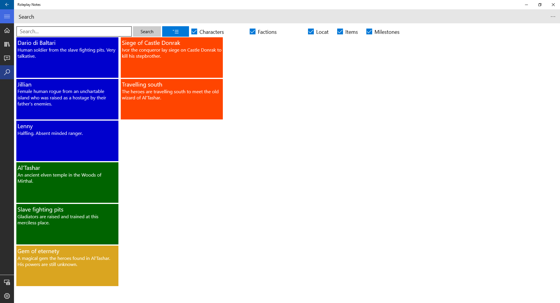 Both as gamemaster and gamer in role-playing sessions you have to remember a lot of things. Save important information in Roleplay Notes to find them later more easily. Which characters were involved in which event? When did they meet each other? Where have they found that magical item, and what else happened there?