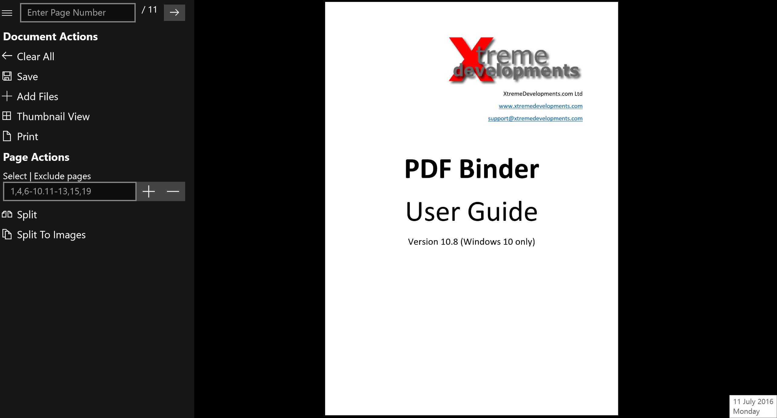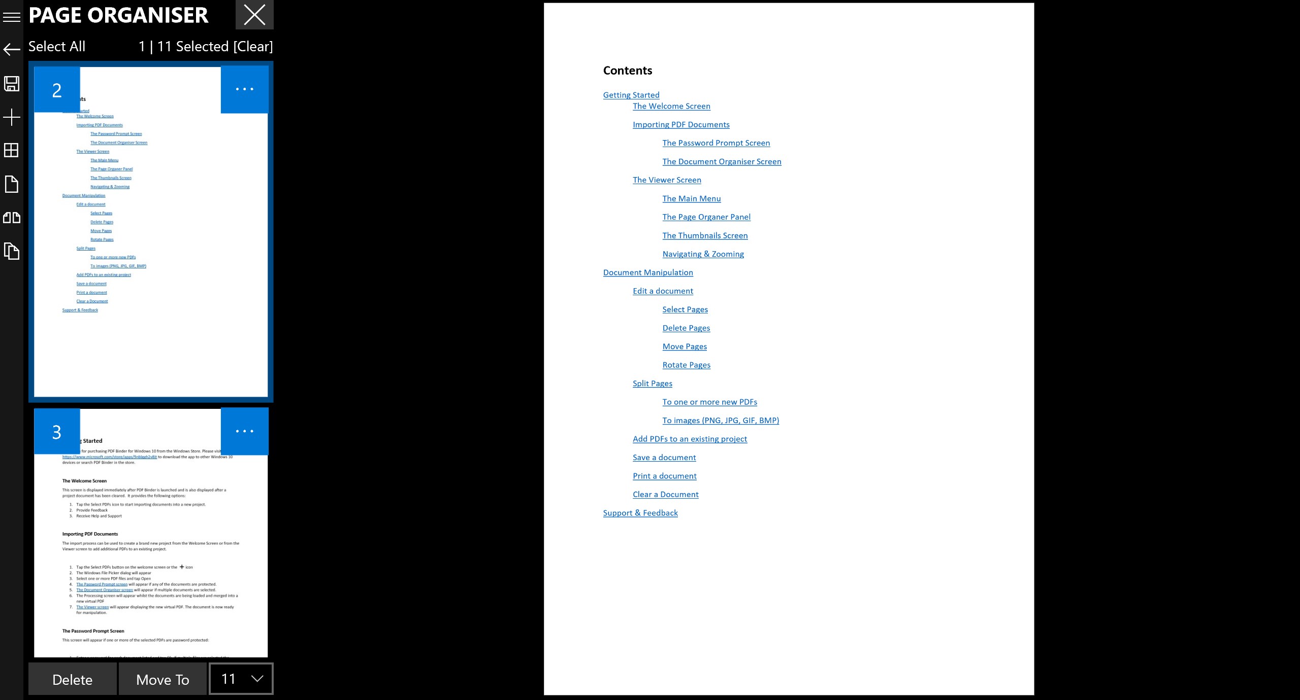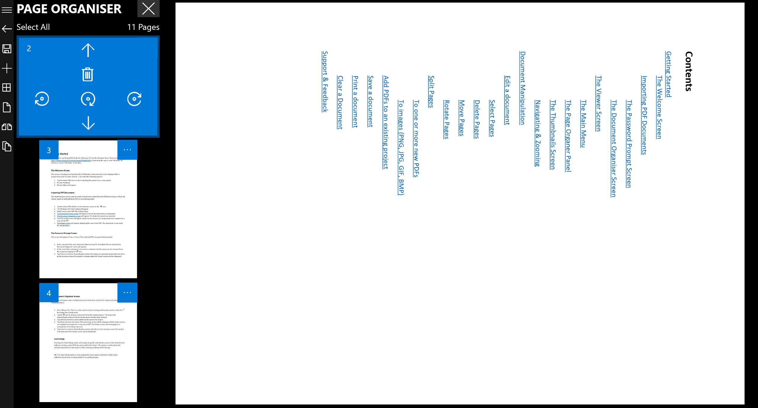 Once PDF Binder has pulled your desired documents together this user friendly app makes it easy to move, delete and rotate pages and extract one or more pages to a new PDF or image (BMP, GIF, JPG, PNG)