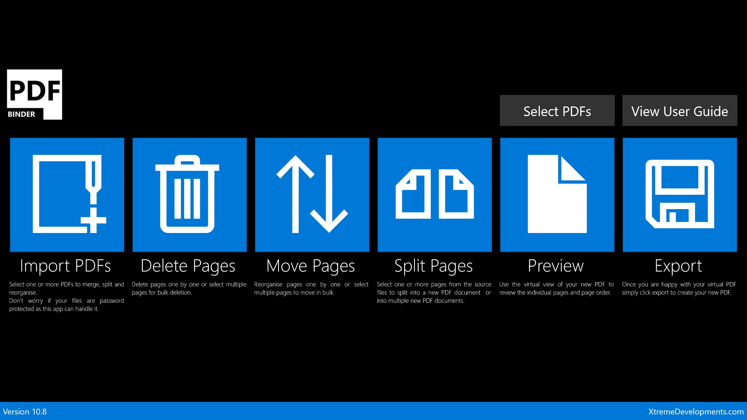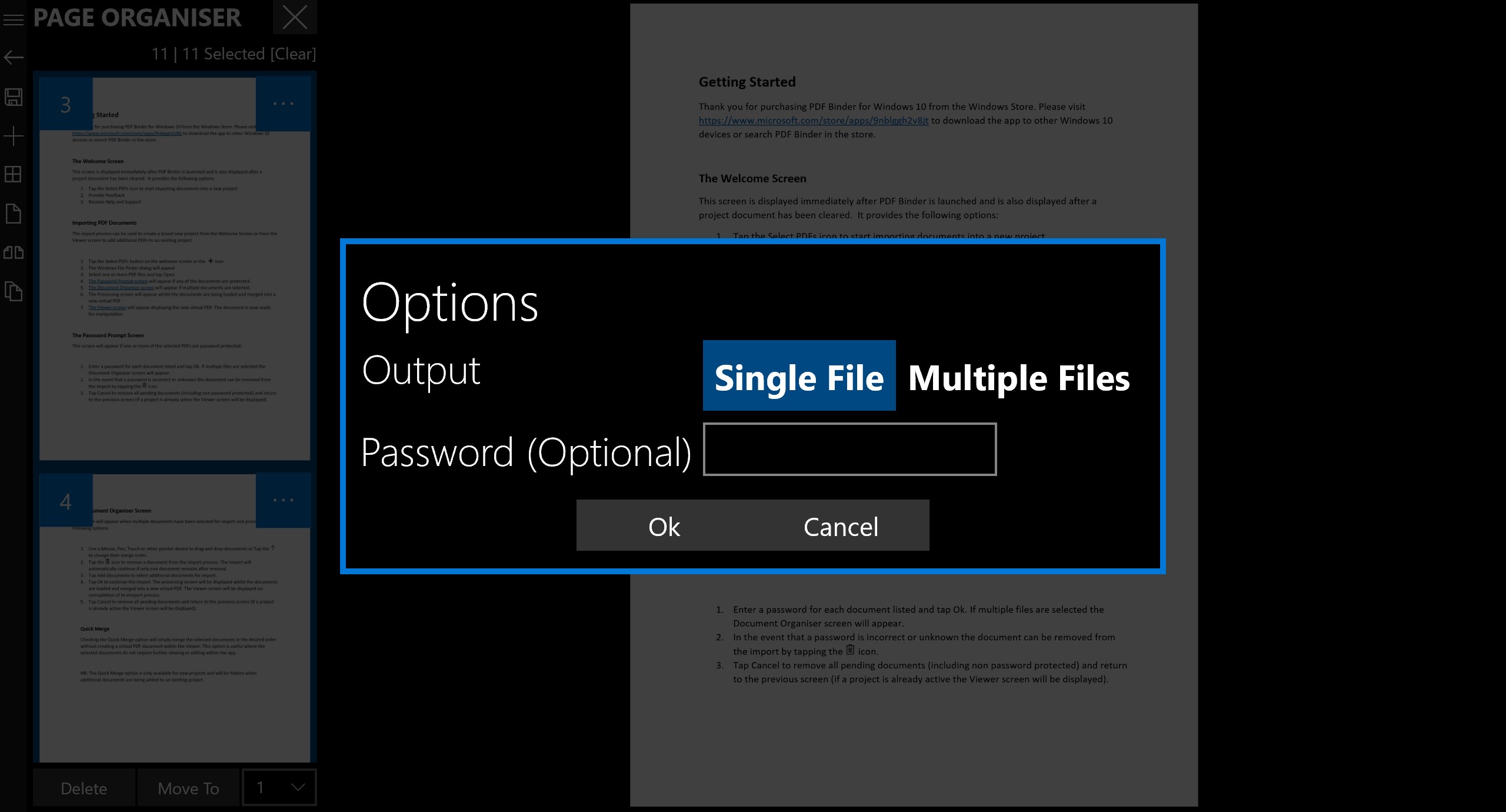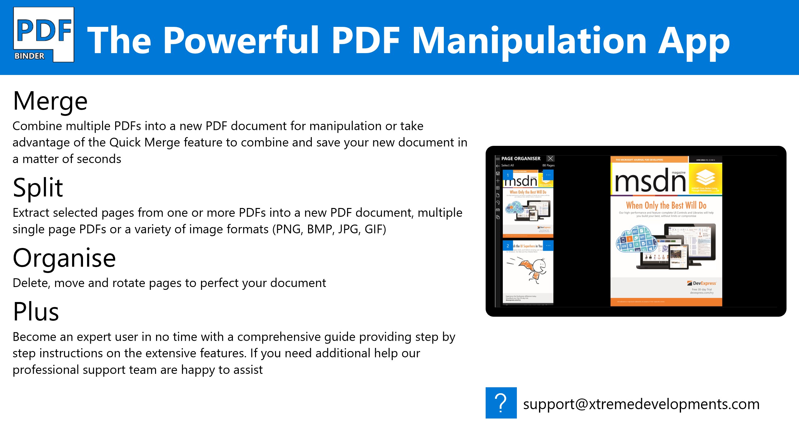 Once PDF Binder has pulled your desired documents together this user friendly app makes it easy to move, delete and rotate pages and extract one or more pages to a new PDF or image (BMP, GIF, JPG, PNG)