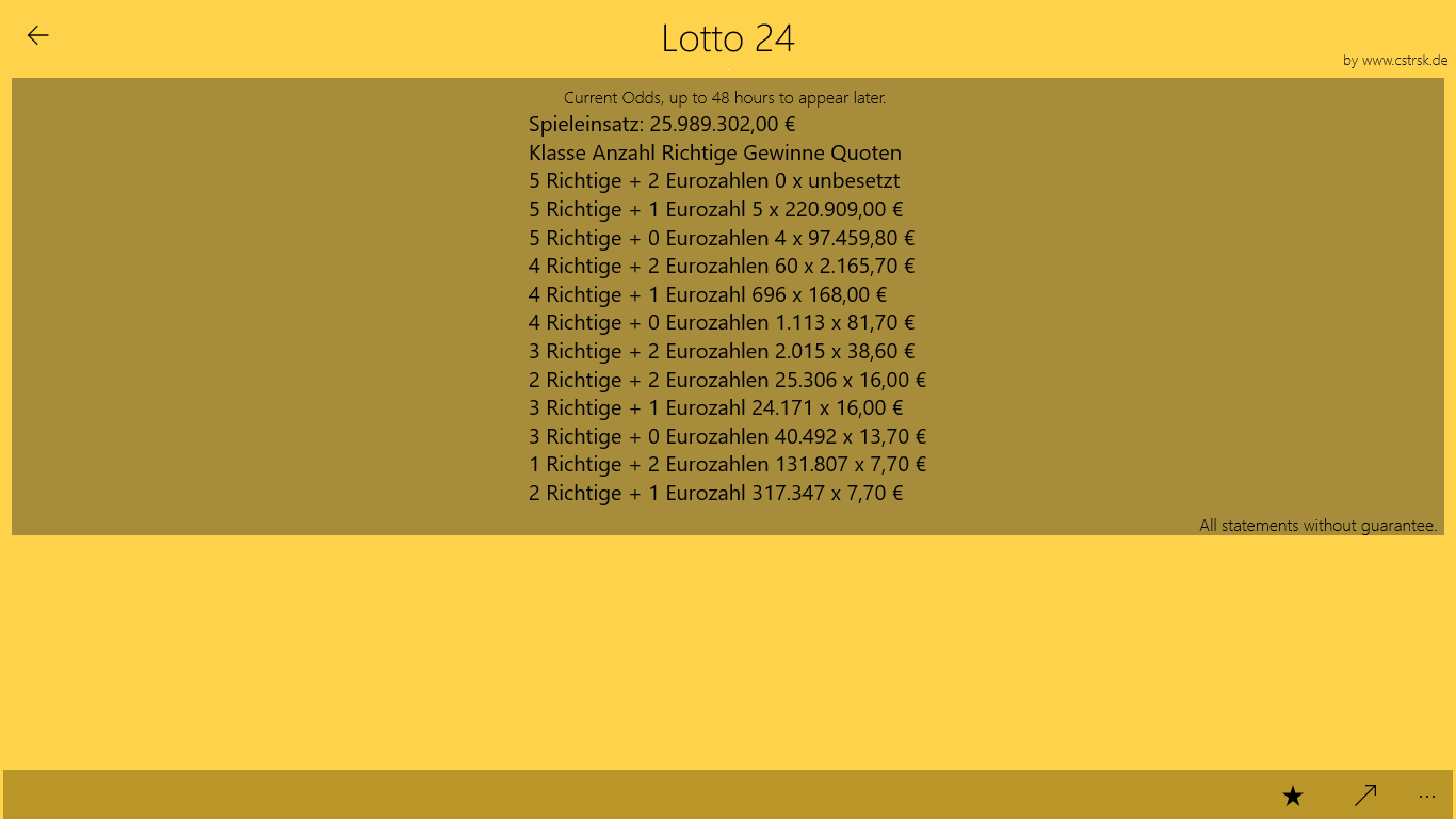 With Lotto 24 you can read fast the current jackpot of Euro jackpot and Lotto 6 from 49 out, as the latest figures of the slogans of the euro jackpots and Euro figures. In addition, also for Lotto 6 aus 49 Jackpot and the lottery numbers, super speed, and super game 77 6. Live Tile denotes Akktuellen Jackpot! Users now for Windows 10 with the current quota of the actual drawings.