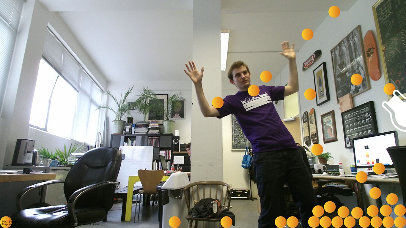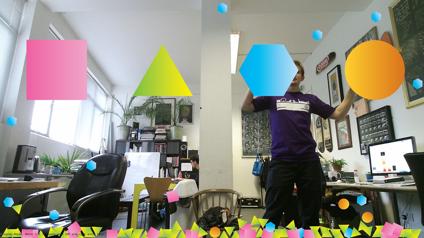 3 Applications to choose fromReach - Touch virtual shapes to pour objects onto the screenFlow - Move around the scene to attach virtual streamers to your bodyBalance - Make noise to fire virtual balls into the scene that bound off your body3 View modes to choose fromMirror - See yourself with graphics overlayedInvisible - See only the graphicsMirror + Skeleton - See yourself with information about where the kinect thinks you are overlayed
