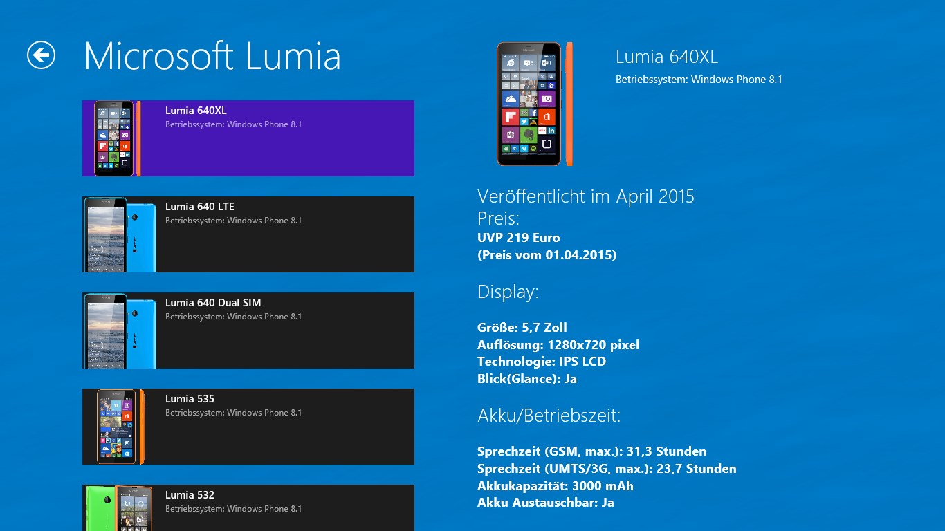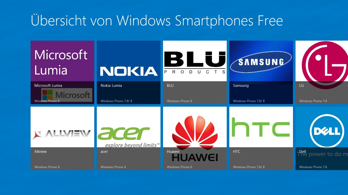 Mit dieser App verschaffen Sie sich ganz einfach und schnell einen Überblick über alle Aktuellen Windows 10 Mobile*, Windows Phone 8* Modelle sowie allen Geräten mit Windows Phone 7*.