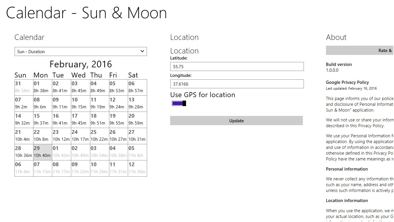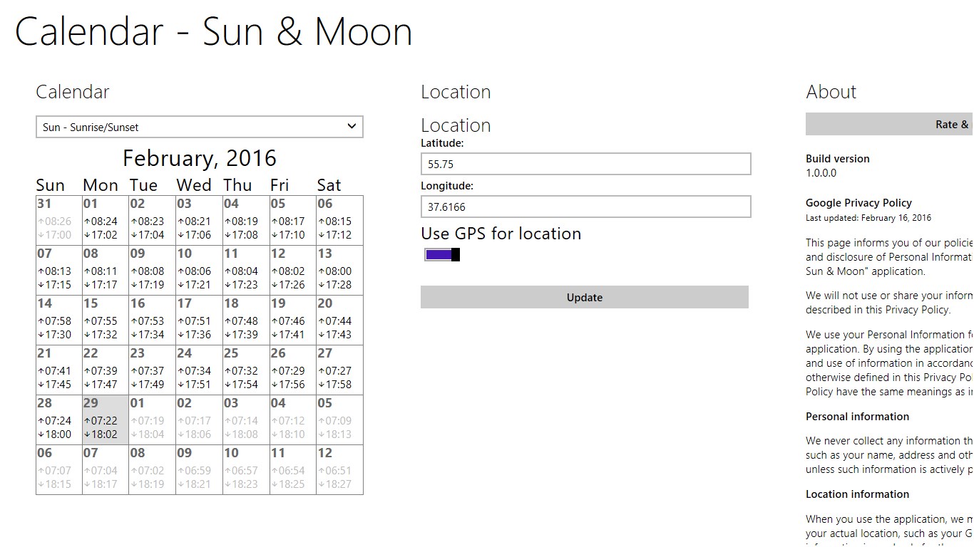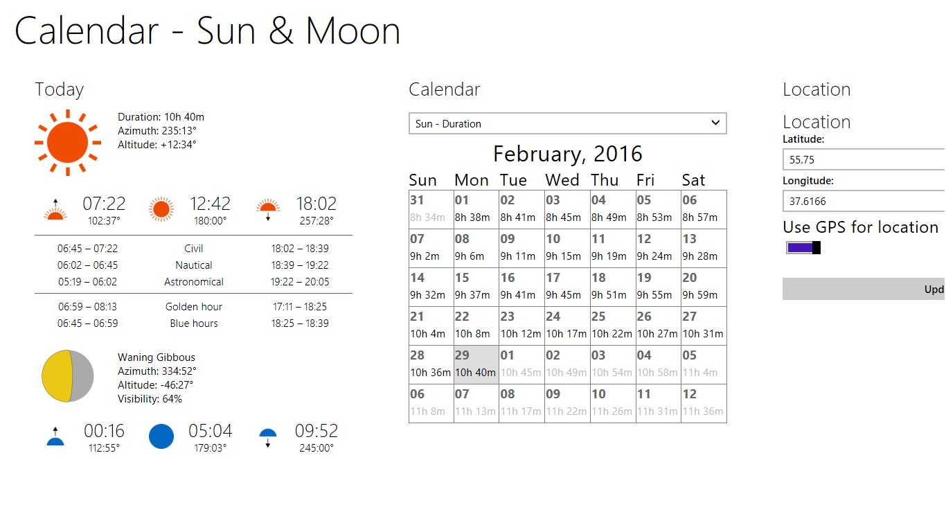 This application is used to determine the position of sun and moon anywhere in the world, and help you determine the time of sunrise and sunset, twilight, the duration of the day, moon phase and much more. With this program you can predict the best time for taking pictures of landscapes, nature, and any other outdoors shooting, as well as a variety of astronomical observations. Also the program will be useful to calculate the days and hours of maximum activity of animals and fish, depending on the position of the sun and moon in the sky (the time when the moon is in the upper and lower points of its orbit with respect to the observer's position, as well as when the moon is midway between the upper and lower points - see. John Alden Knight - "Solunar theory").