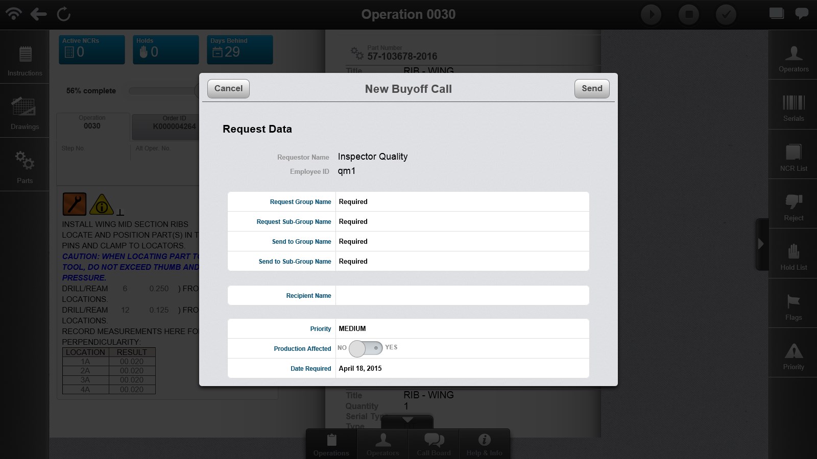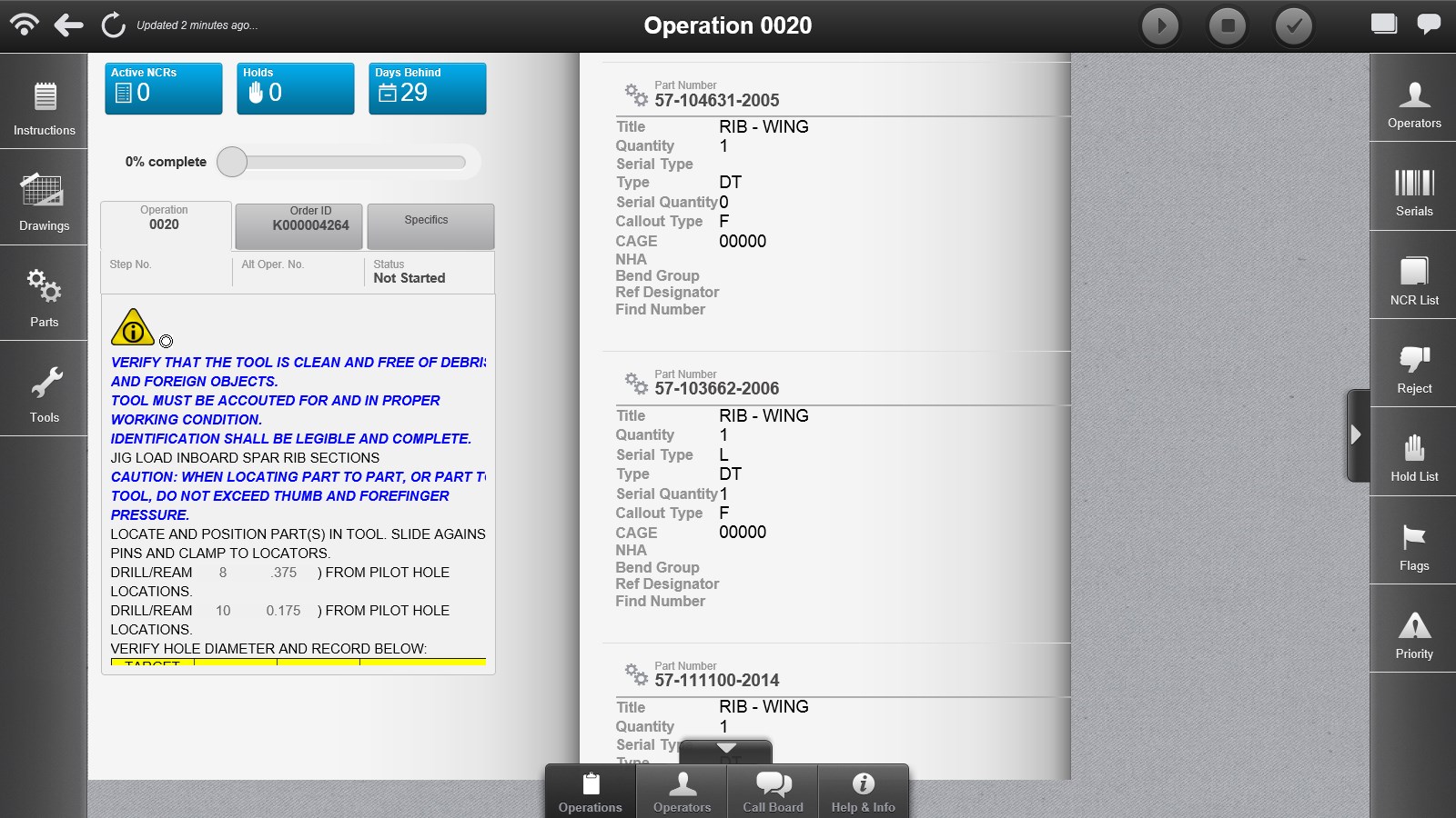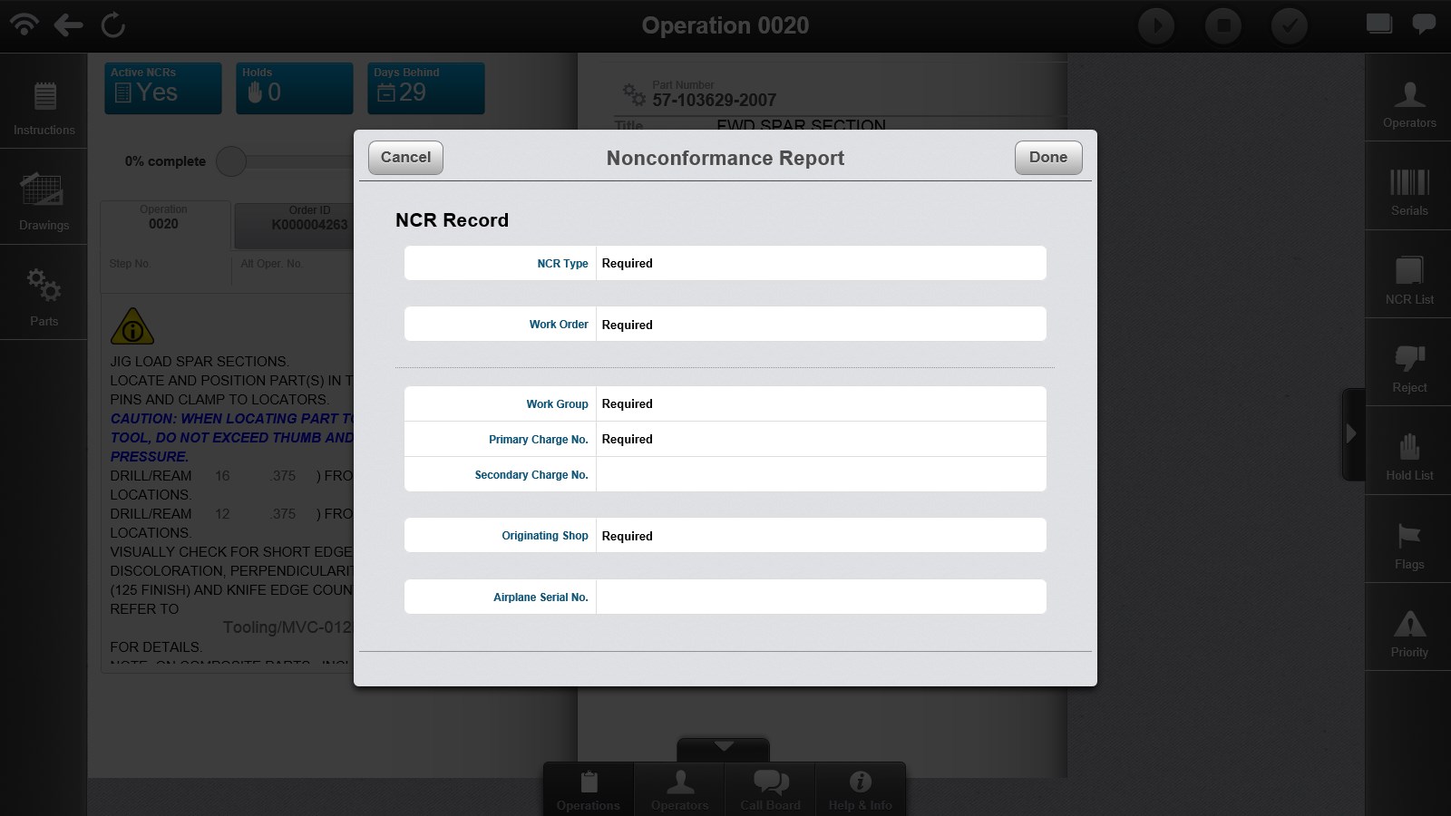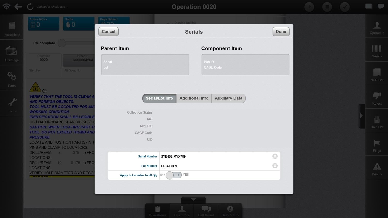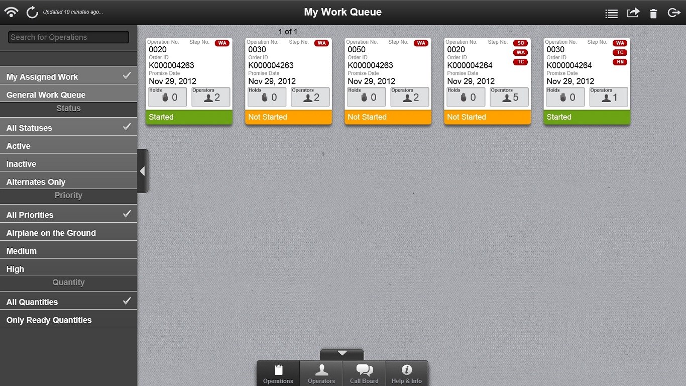 View current state of work and personnelDisplay operation-level data, including text, documents, images, and supporting informationPerform operation-level data entry, buy-offs, and serial and lot number collection and recordingManage hold operations and generate nonconformance records against a nonconforming itemStart, stop, complete, reject, resubmit, re-inspect, hold, and release hold operations