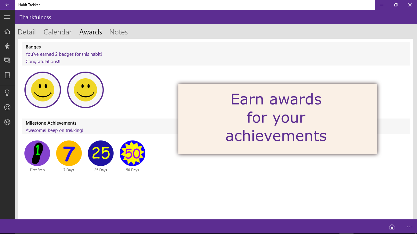It's fun and easy to get on the path to positive habits with Habit Trekker! Track your progress, reach your goals, and earn badges for your achievements. Hundreds of samples for dozens of categories will help get you started.