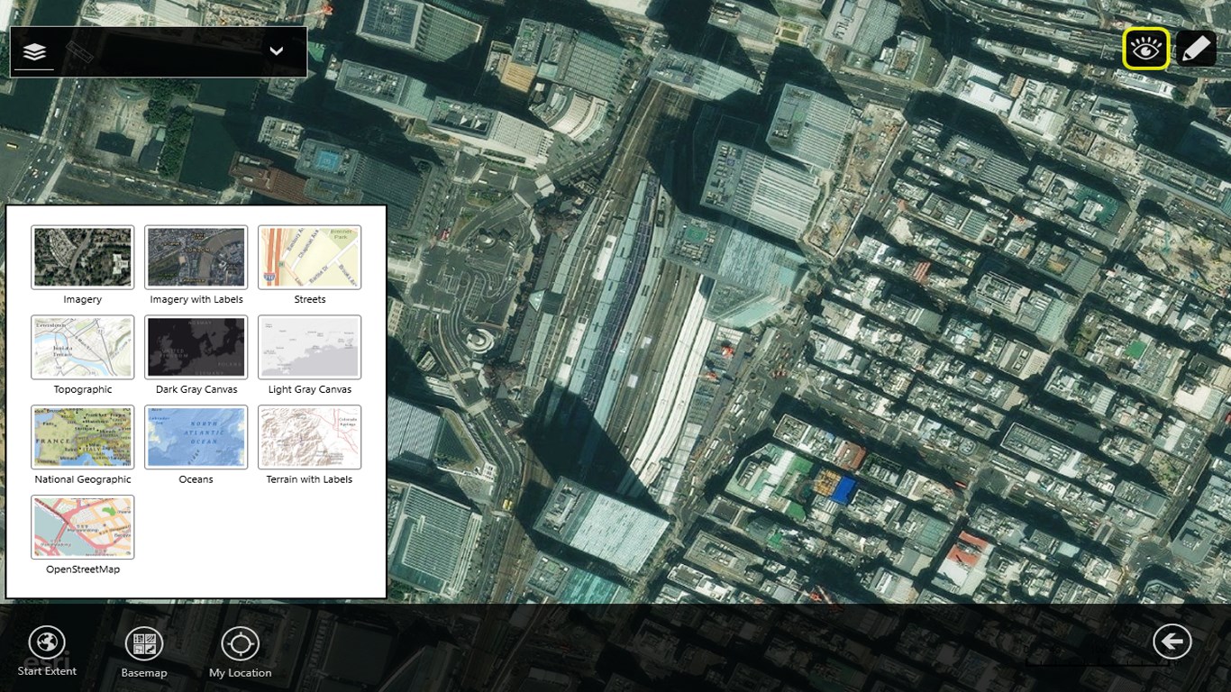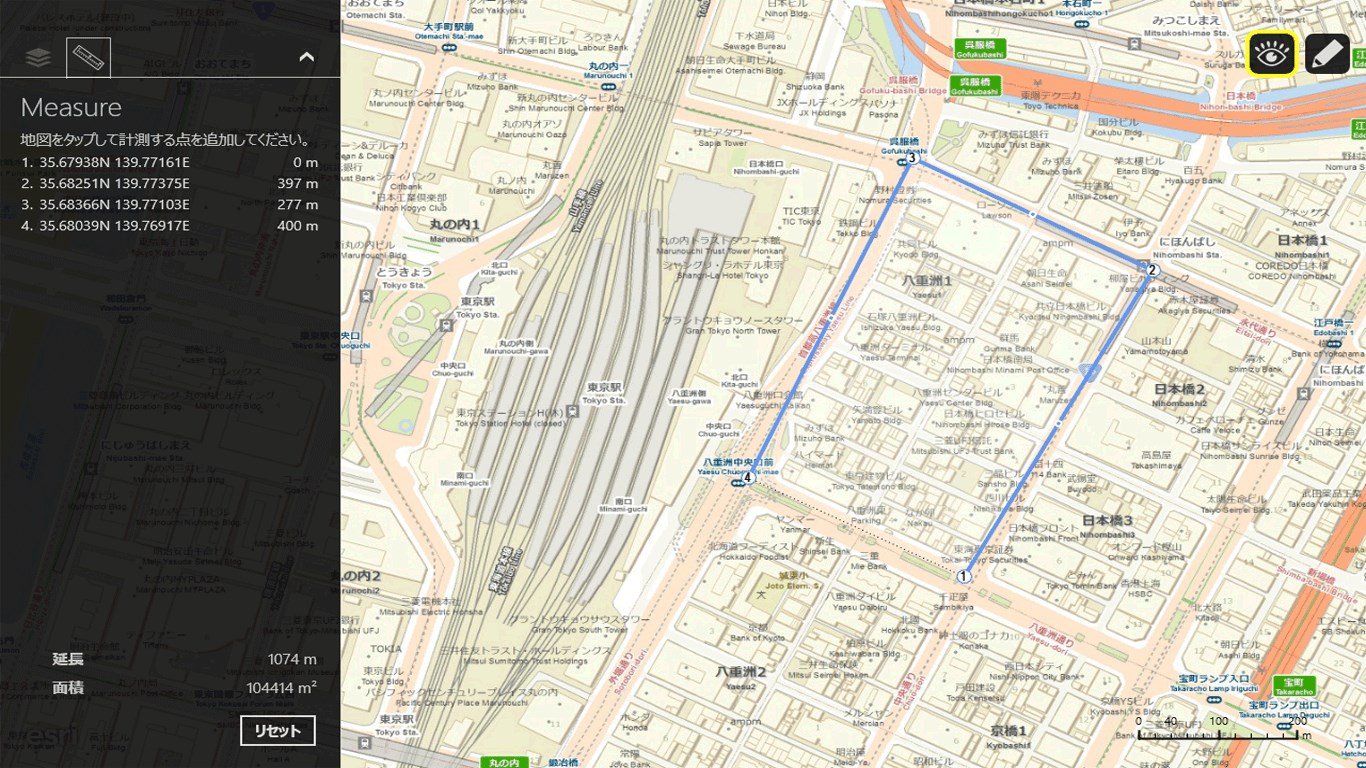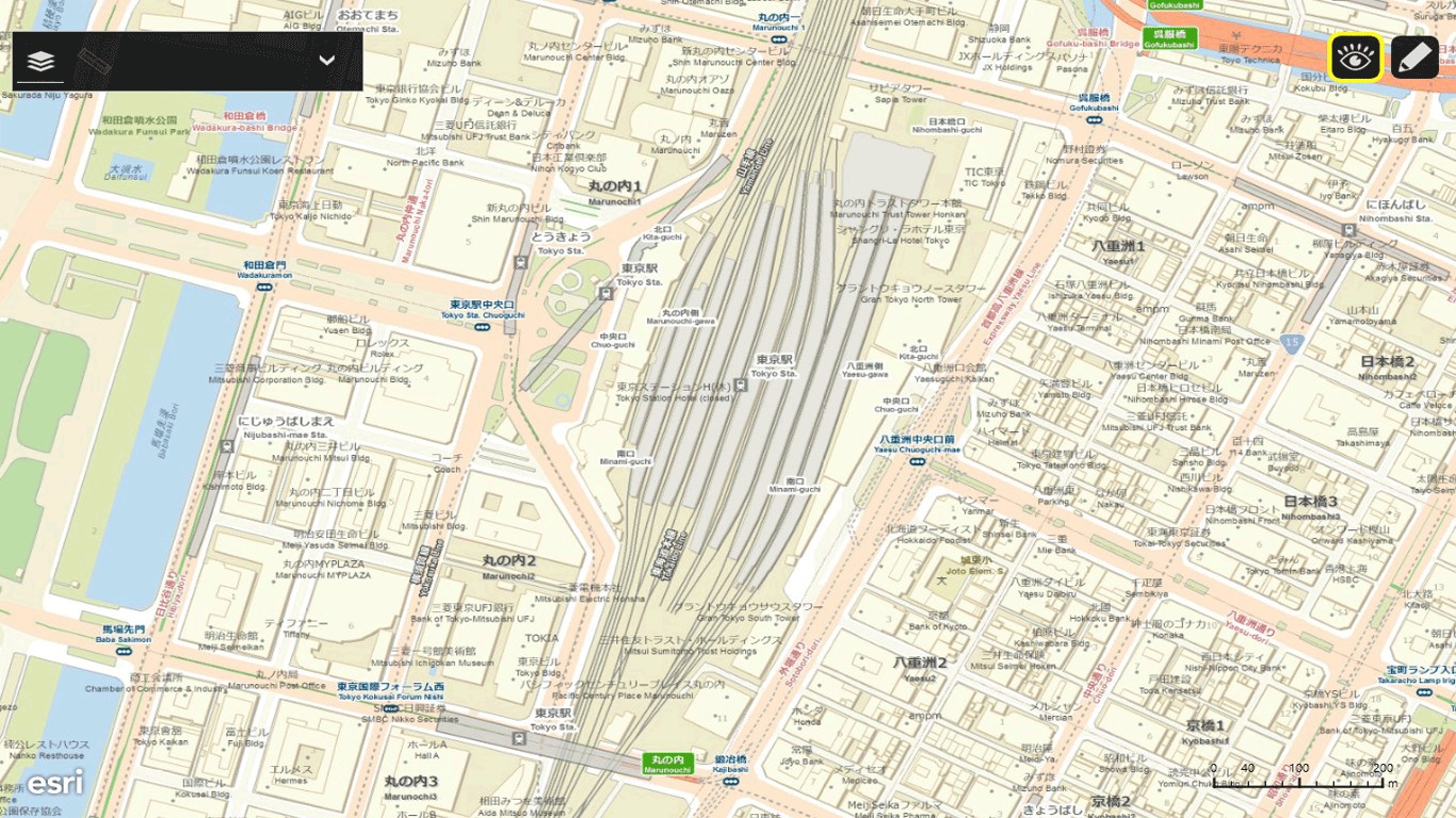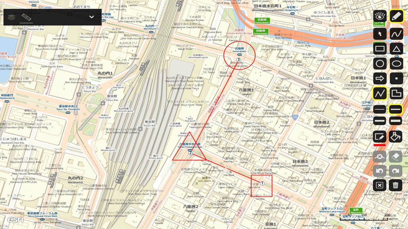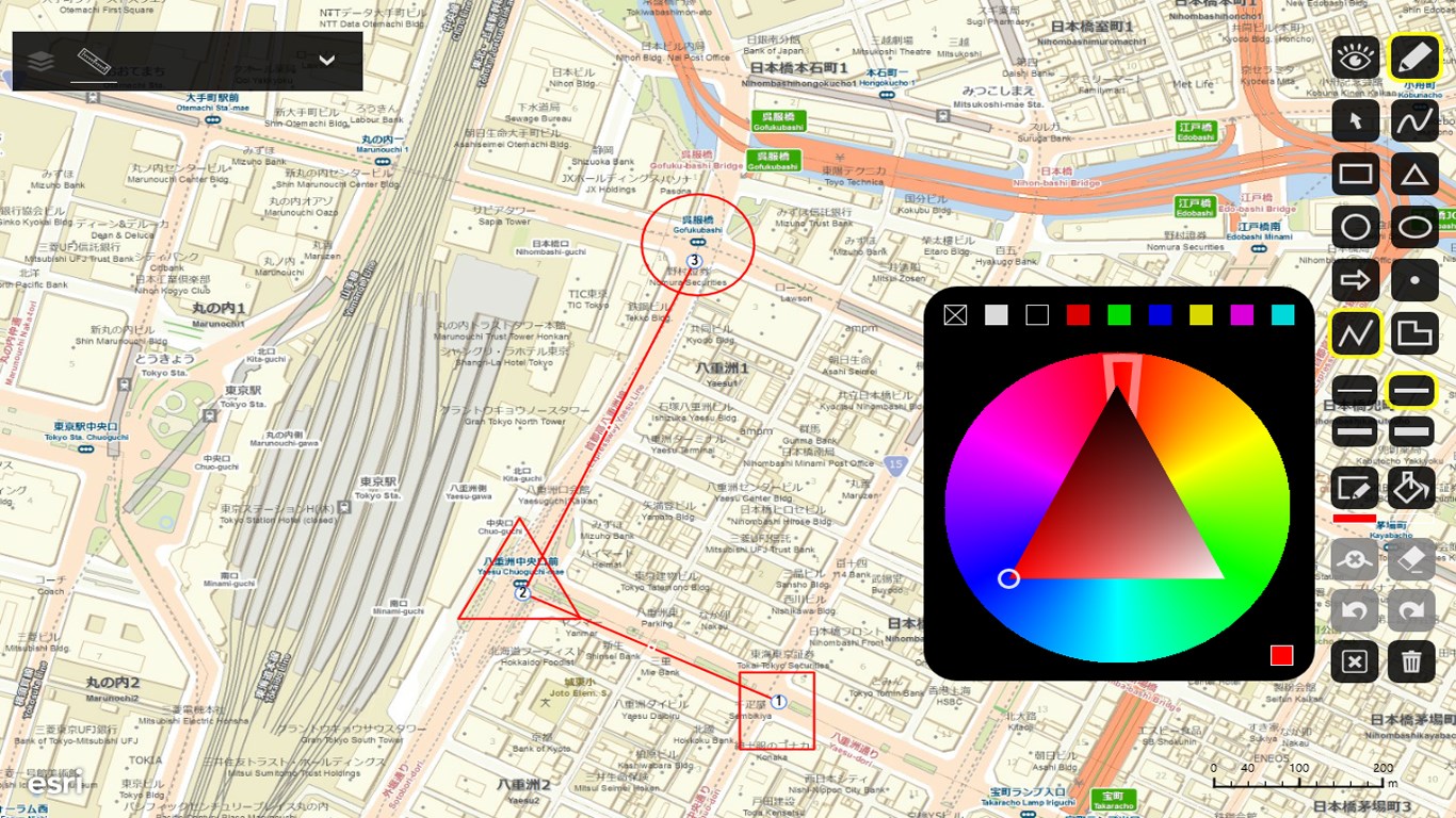 Esri社のArcGIS Onlineの詳細なベースマップ(道路地図、航空写真、陰影図など)上で、自由にお絵かきをすることができます。