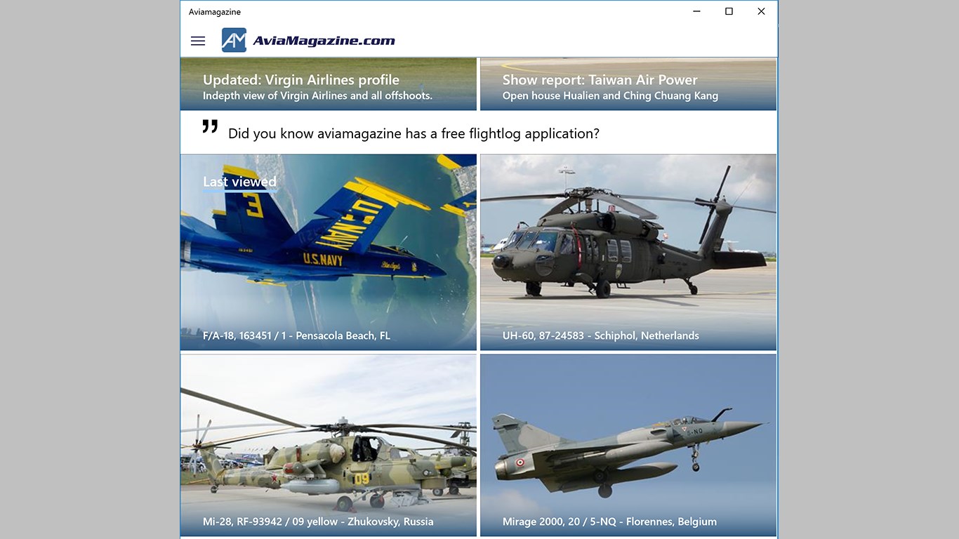 Whats new, latest added articles to website.Random pic, shows a random photo from the Aviamagazine archives.Last viewed, which photo\'s were viewed last on the website.Aviation Interest, provide your interest to personalize the app content.