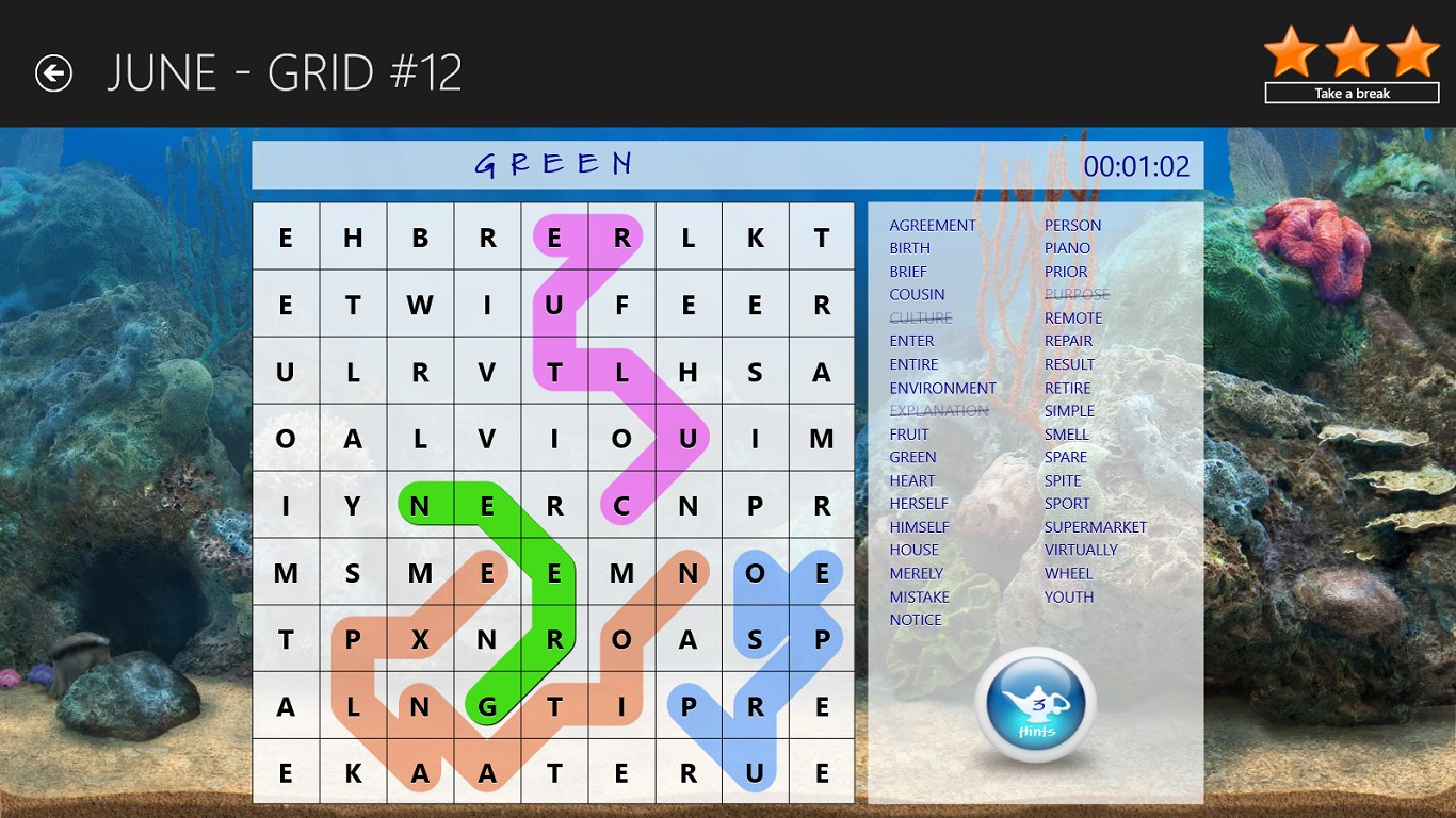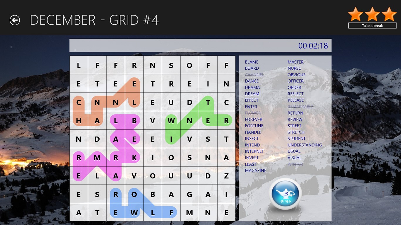 365 awesome gridsRemove the words in a grid using your mouse or fingerUse the magic lamp to get some hintsBe quick enough to collect all the starsBeautiful graphics