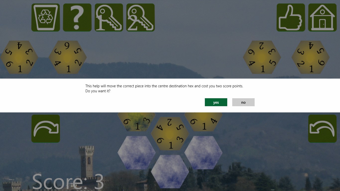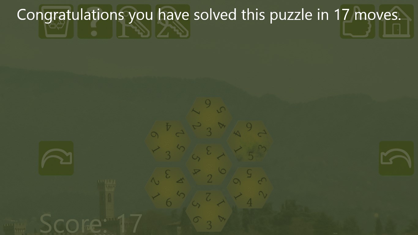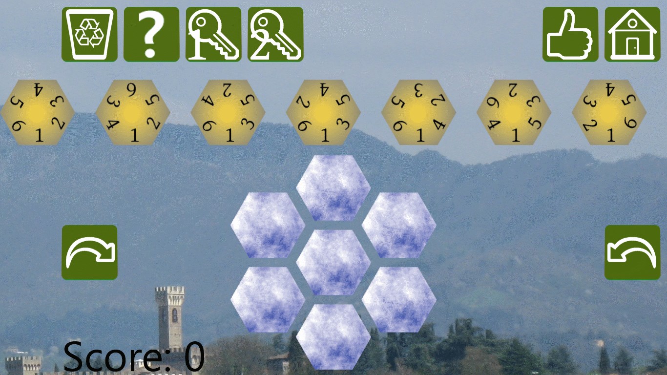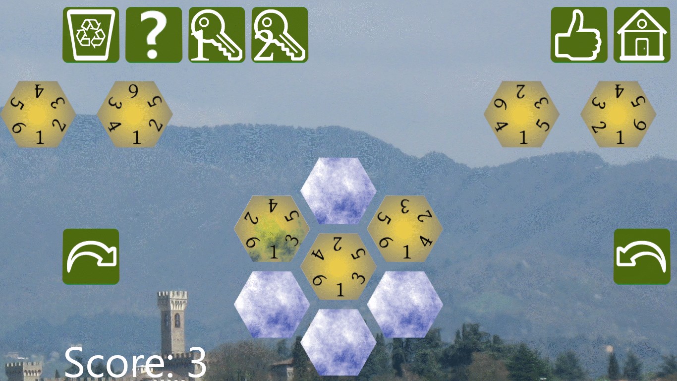 Arrange the seven hexagons on the playing field so that one is in the centre and the others are arranged around it. All touching numbers must be the same.