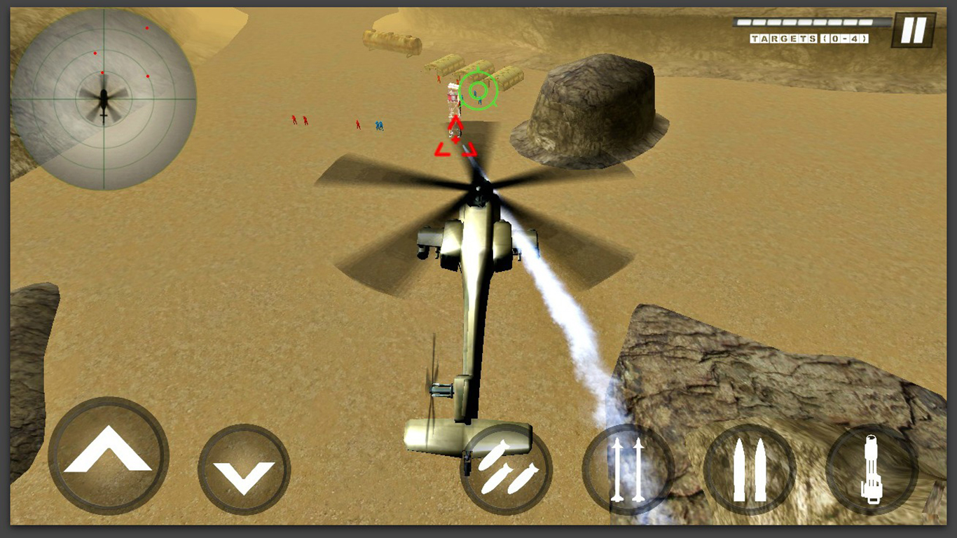 Multiple missions.Opportunity to choose your favorite Helicopter with distinctive features.Select variety of Arms for your chopper.Aircraft flying experience in real 3D environment.Successful completion of a mission will lead you to the next mission i.e. more challenging and dangerous.